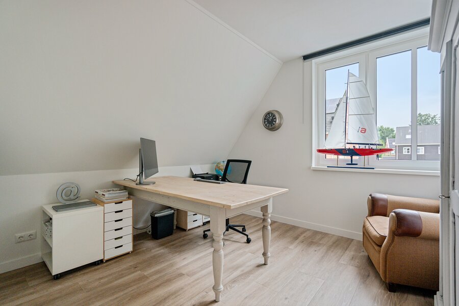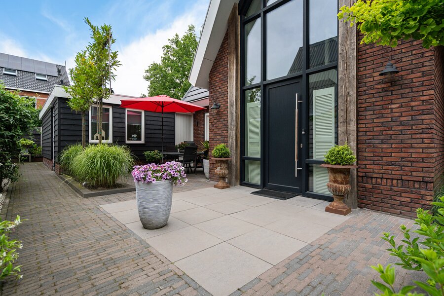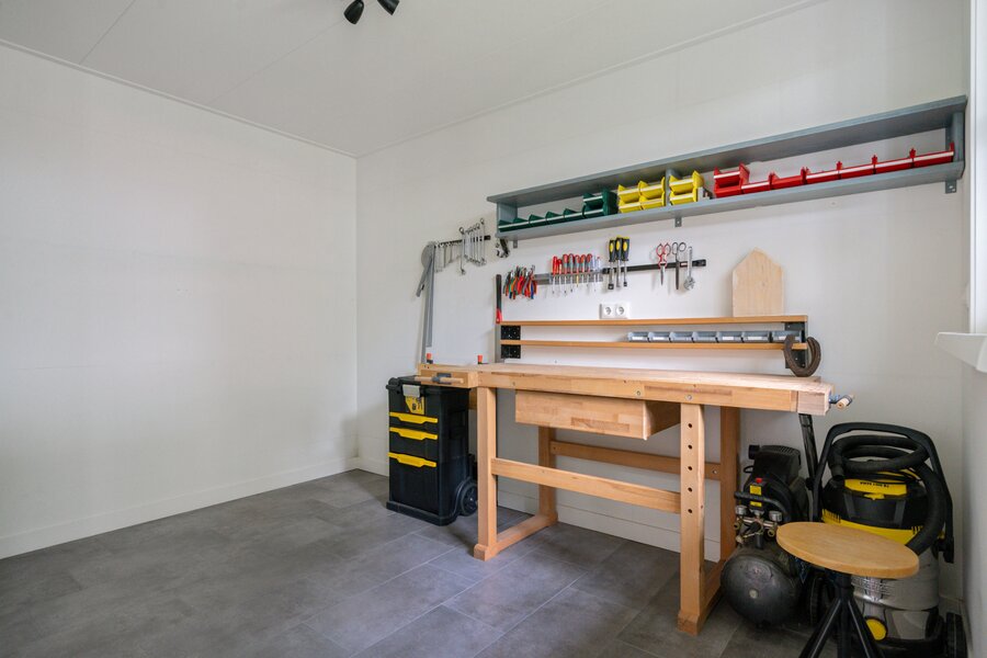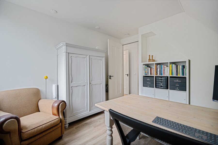 Aan de achterzijde is een fraai bijgebouw gerealiseerd, voorzien van eigen ingang, vloerverwarming en keukenblok. Extra woonoppervlak geschikt voor o.a. praktijk aan huis, atelier, werkruimte of wellicht een eigen plekje voor opgroeiende kinderen. Uiteraard kan deze ruimte ook als berging gebruikt worden.