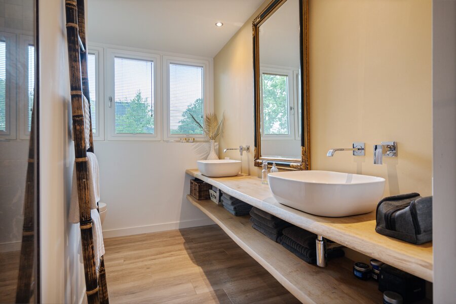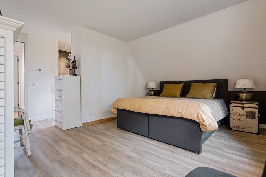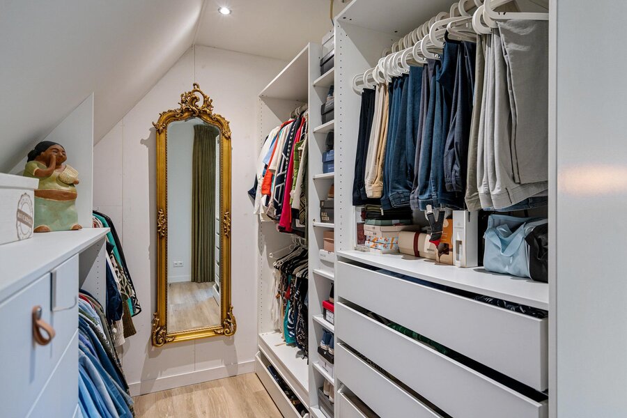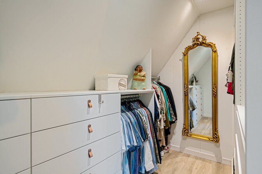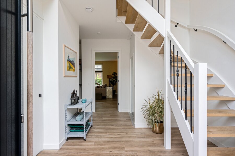 In de hal valt direct de royale opzet van deze sfeervolle woning op. Dank zij de hoge ramen stroomt het natuurlijke licht rijkelijk naar binnen, wat zorgt voor een lichte open sfeer. Verder toilet en garderobe.