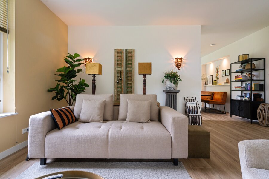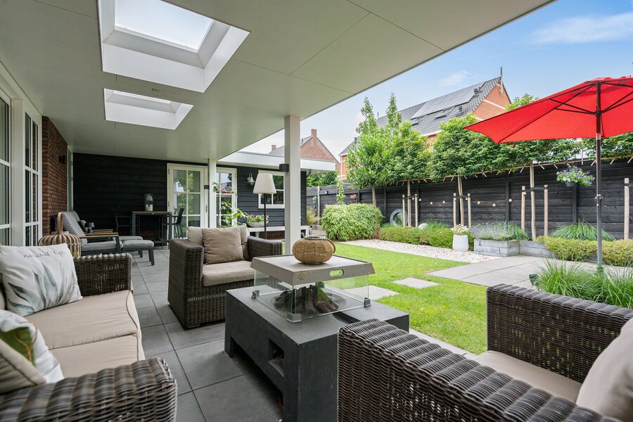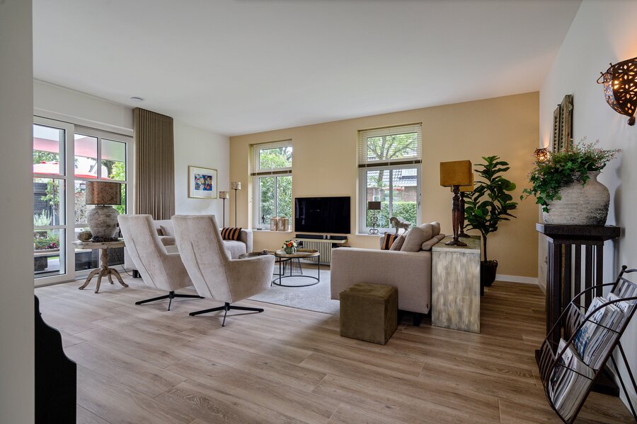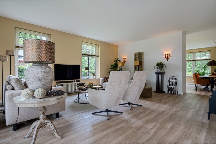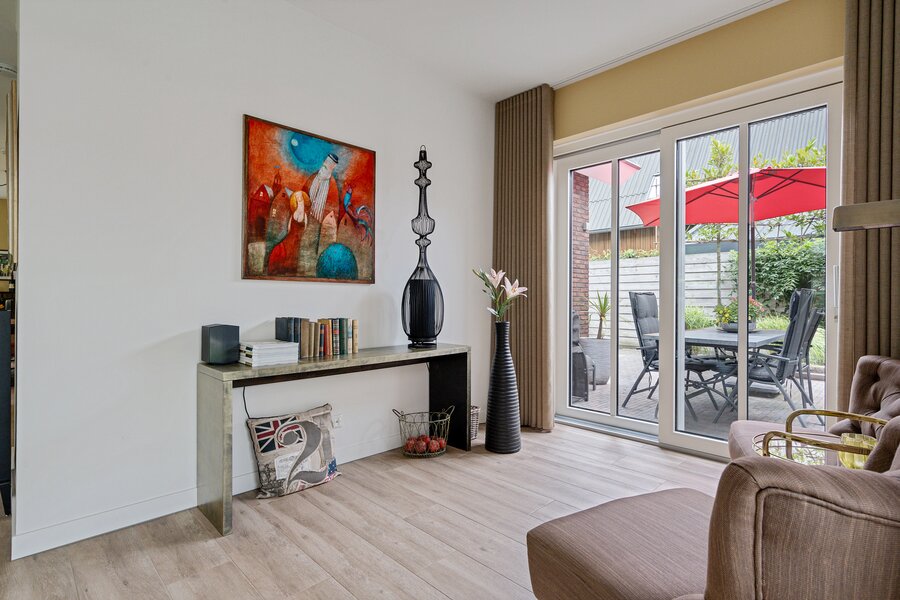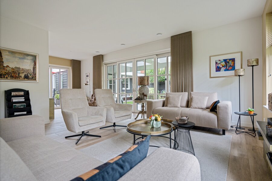 De ruime woonkamer is aan 2 zijden voorzien van schuifpuien, die een naadloze verbinding creëren met de fraai aangelegde tuin rondom.