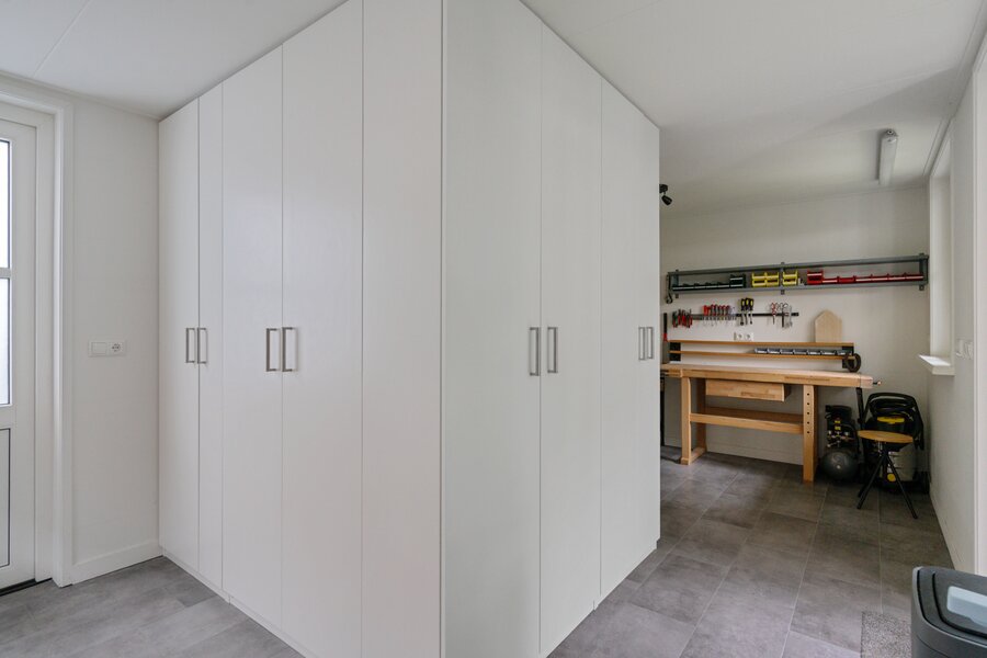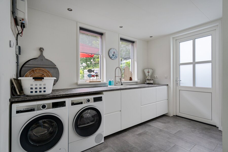 Vanuit de keuken is er directe toegang tot de bijkeuken met keukenblok en koel/vries combinatie. Tevens is dit de technische ruimte waar onder andere de warmtepomp en de boiler opgesteld staan.