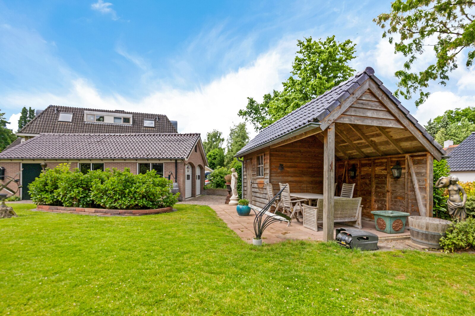 Op het riante perceel bevindt zich een royale schuur met ruimte voor twee auto’s. Deze ruimte leent zich daarnaast uitstekend als werkplaats of extra opslag. Ook is er een houten berging met overkapping, ideaal voor het opbergen van tuingereedschap of als sfeervolle beschutte zitplek.