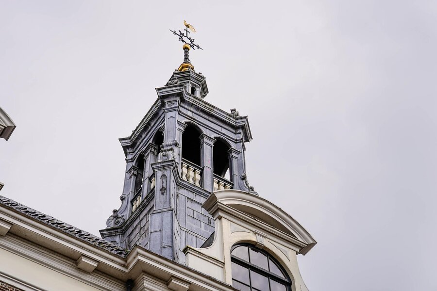 Het schilddak wordt versierd met een dakkapel met een gebroken fronton. Een fronton is de driehoekige beëindiging boven op de dakkapel. De overgang tussen de dak en de gevel wordt extra benadrukt door de dakgoot die wordt uitgevoerd met een sierlijst en ondersteund door siergootklossen. Direct bij het verlaten van de Hoogstraat richting het Damplein is een monumentaal pand met een schildkap te zien.