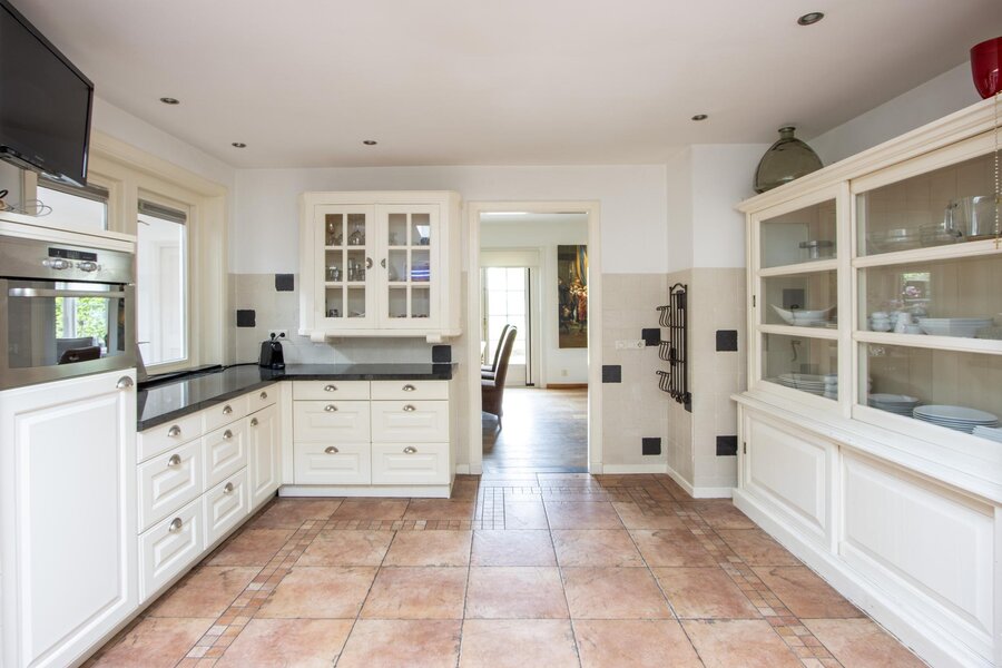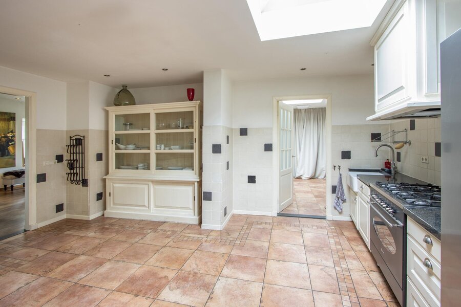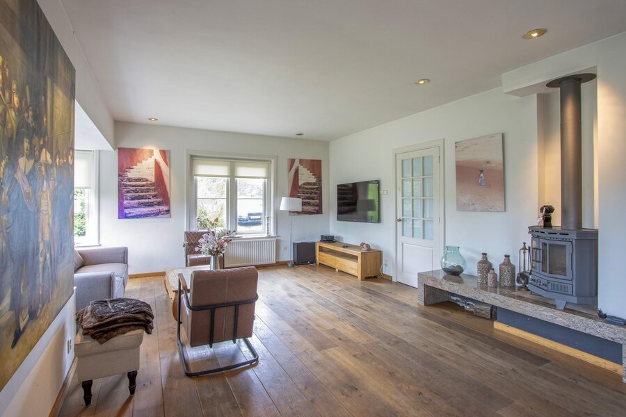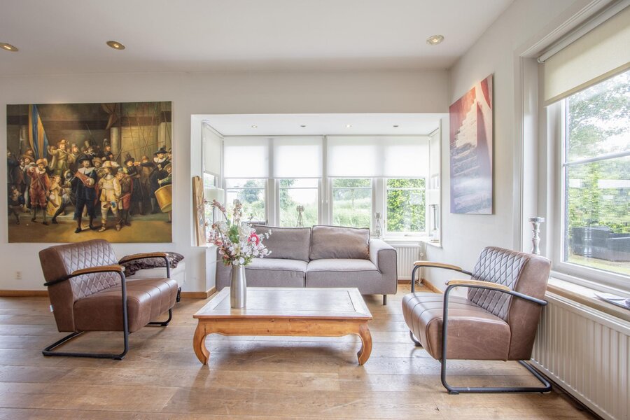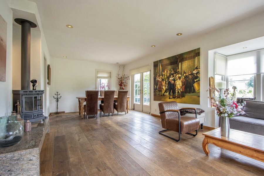 De woonkamer is opmerkelijk licht met veel ramen en een erker en is tevens voorzien van een kachel. Aan de achterzijde loopt de woonkamer door in het eetgedeelte. Vanuit hier is de ruime en centrale leefkeuken te bereiken. Deze landelijke keuken is voorzien van veel opbergruimte en daarnaast over de nodige inbouwapparatuur. De inpandige garage heeft naast twee openslaande deuren vanaf het erf ook een toegang vanuit de keuken.
