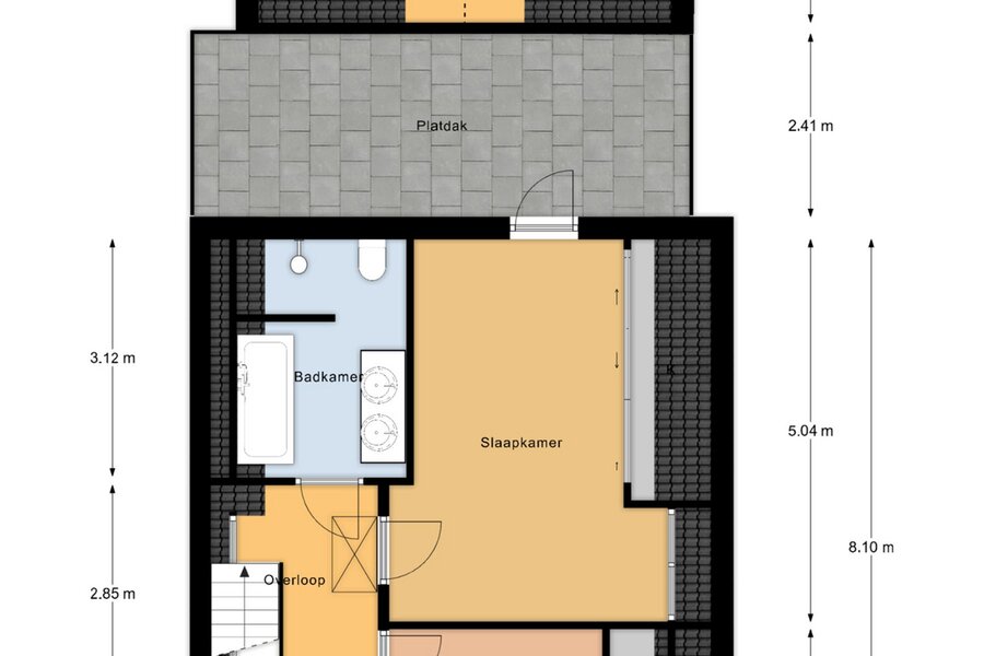 In het voorhuis zijn er op de eerste verdieping drie slaapkamers gerealiseerd waarbij de hoofdslaapkamer aan de achterzijde een uitgang heeft naar het platte dak tussen het voor- en achtergedeelte. Naast de hoofdslaapkamer is de badkamer gesitueerd die thans voorzien is van een ligbad, separate douche, toilet alsmede dubbele wastafel.