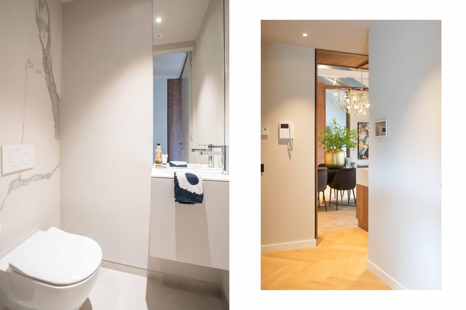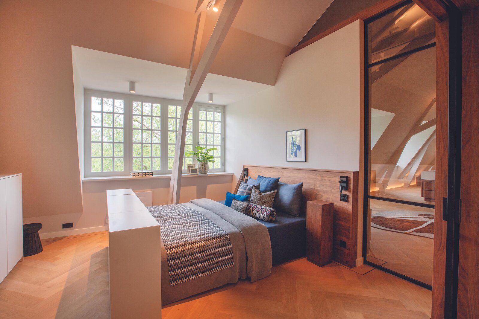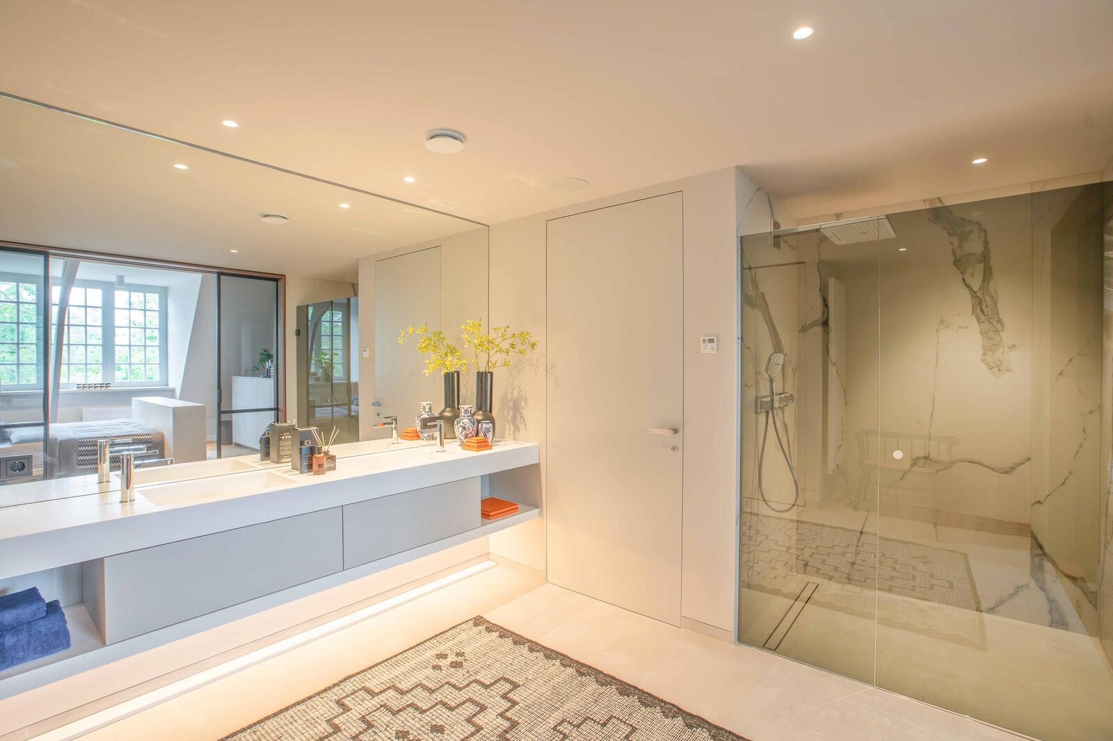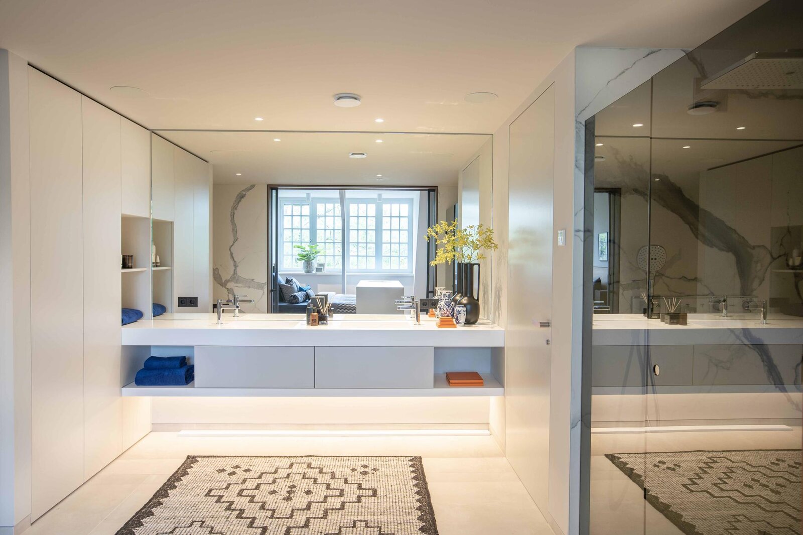 De masterbedroom is een serene ruimte, met veel daglicht en opnieuw hoogwaardige maatwerkkasten. Een stijlvol glazen schuifpaneel scheidt deze kamer van de royale badkamer en suite, waarin hetzelfde unieke blad als in de keuken terugkomt. De badkamer heeft een royale inloopdouche met regendouche en handdouche, een apart Japans toilet en een dubbele wastafel. Een fraai detail zijn de marmeren wanden uit één stuk. Een element dat ook in het toilet in de hal terugkomt. Alles is met elkaar in harmonie – tot in het kleinste detail.