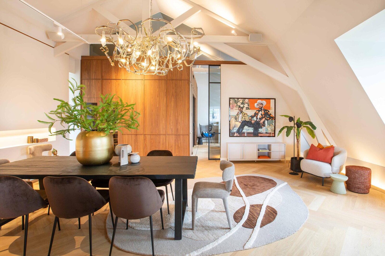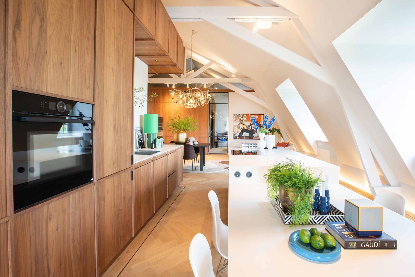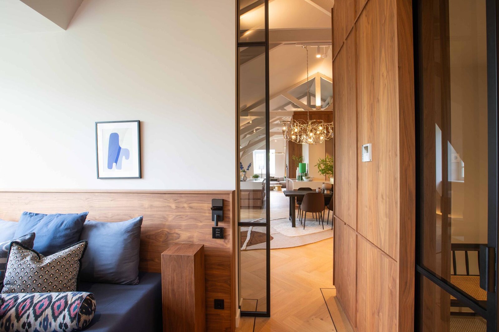 Ook opvallend: de maatwerkkastenwand van Amerikaans notenhout met geïntegreerde tv-oplossing en een speciaal ontworpen kunstnis. Perfect afgestemd op de favoriete objecten van de huidige eigenaar – een subtiele ode aan maatwerk en persoonlijkheid.