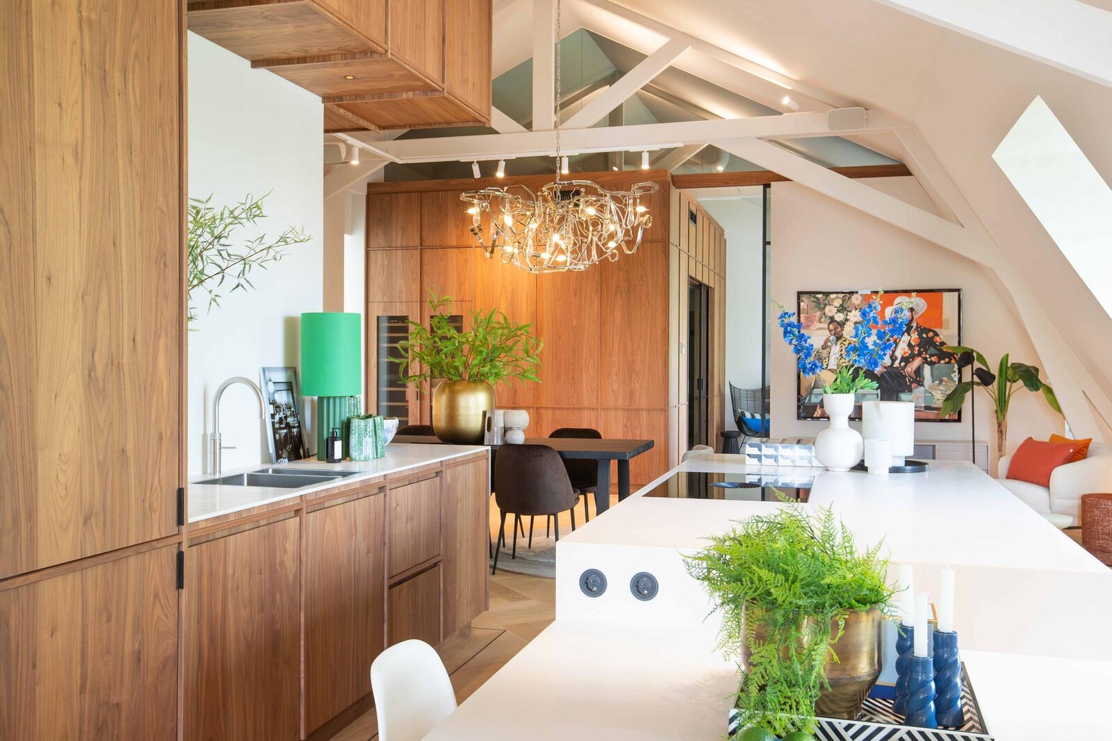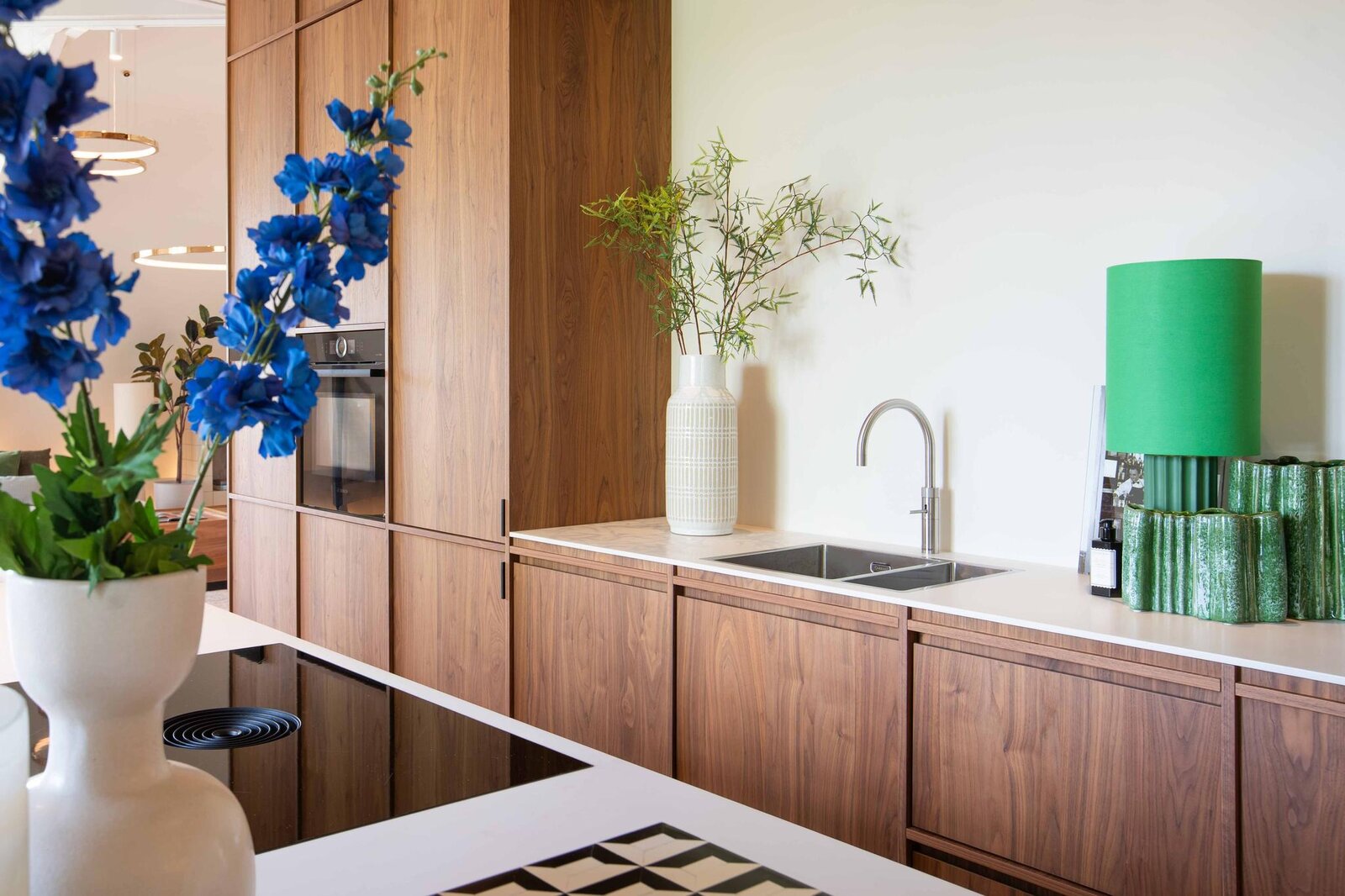 De woonruimte is royaal en licht, met direct zicht op de groene voorzijde van het complex en het glinsterende Klompven daarachter. In het hart van deze ruimte: een keuken waar esthetiek en techniek elkaar ontmoeten. Het werkblad – een sculpturaal geheel uit één stuk – is zo verfijnd geschuurd dat het zijdeachtig aanvoelt. Alle inbouwapparatuur is naadloos geïntegreerd, inclusief een Quooker, een Bosch-oven, een Bora-inductiekookplaat met geïntegreerde afzuiging en dubbele wijnklimaatkasten. De maatwerkkeuken is uitgevoerd in Amerikaans notenhout van uitzonderlijke kwaliteit – geleverd aan de hand van persoonlijke selectie, en vakkundig verwerkt door een interieurbouwer. Een verlengd keukeneiland fungeert als volwaardige eettafel, wat de leefkeuken zijn centrale karakter geeft.