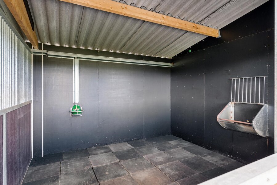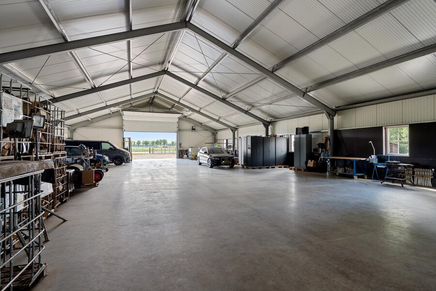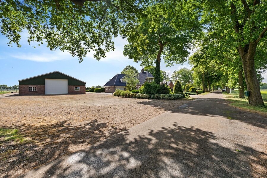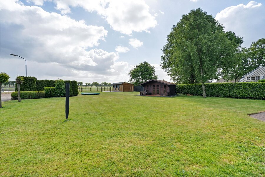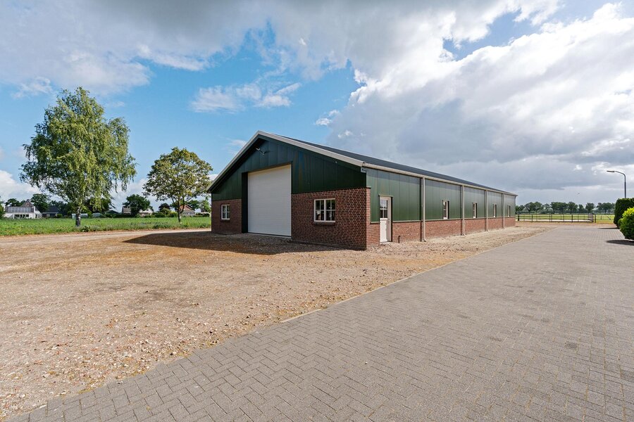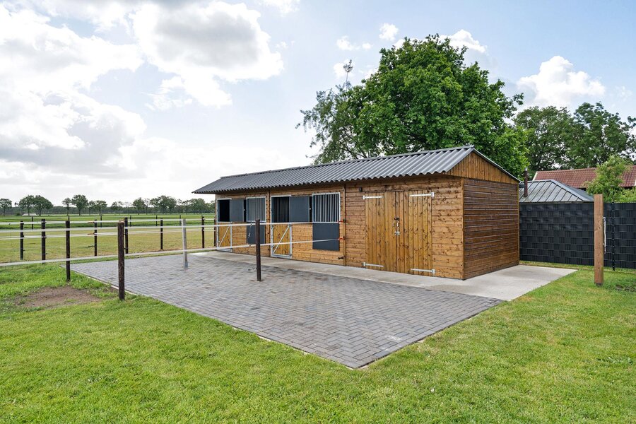 De woning beschikt over een aangebouwde garage, toegankelijk via een aparte buiteningang. Op het royale perceel staat een imposante loods die geschikt is voor uiteenlopende gebruiksmogelijkheden. Daarnaast bevinden zich een sfeervol houten tuinhuis en paardenstallen op het terrein.