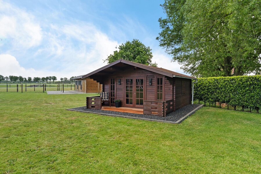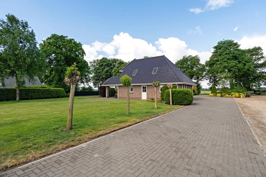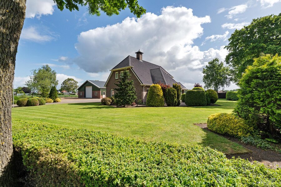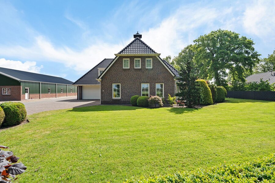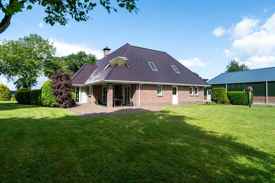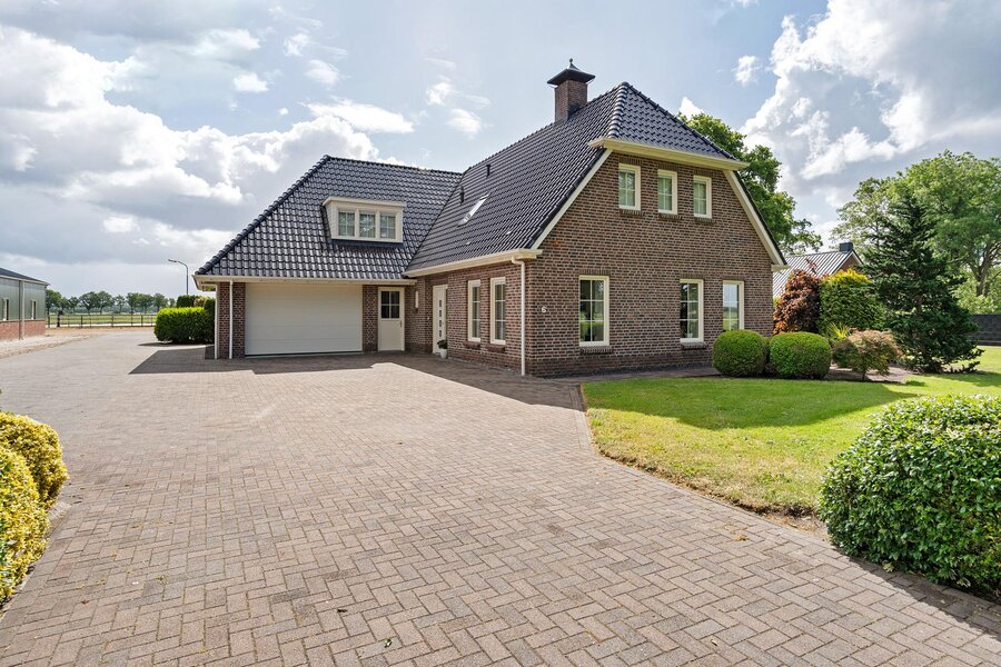 De woning beschikt over een aangebouwde garage, toegankelijk via een aparte buiteningang. Op het royale perceel staat een imposante loods die geschikt is voor uiteenlopende gebruiksmogelijkheden. Daarnaast bevinden zich een sfeervol houten tuinhuis en paardenstallen op het terrein.
