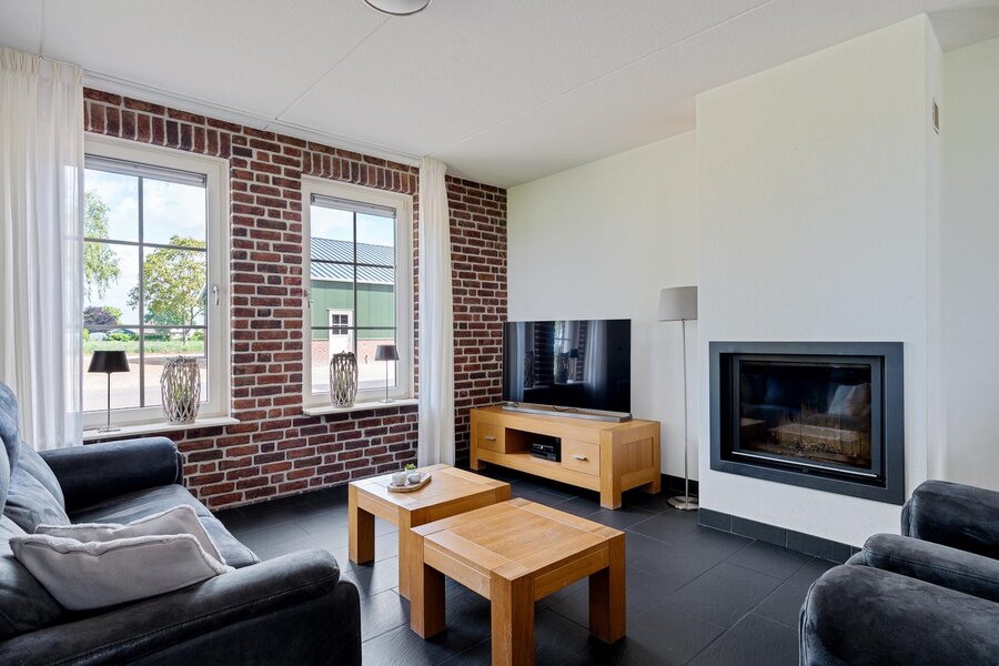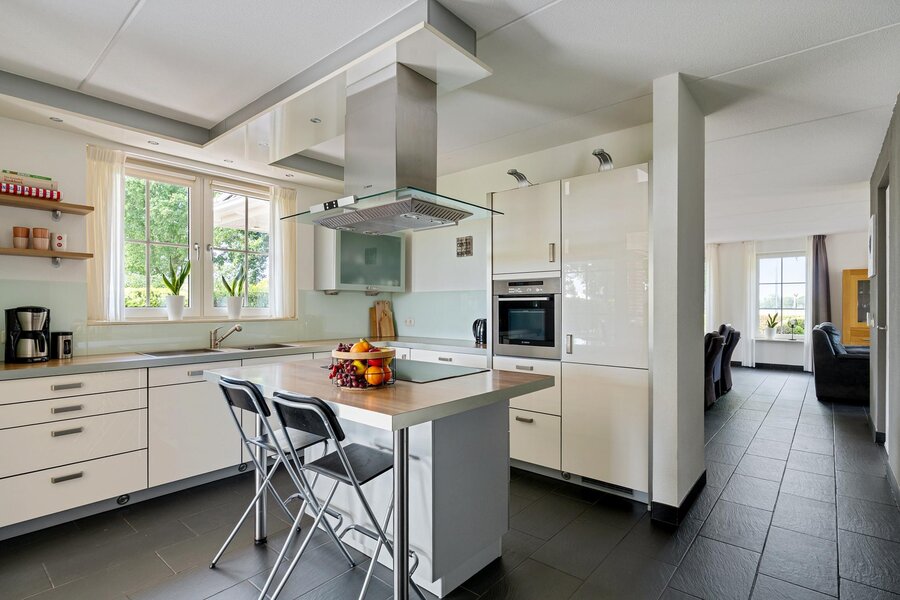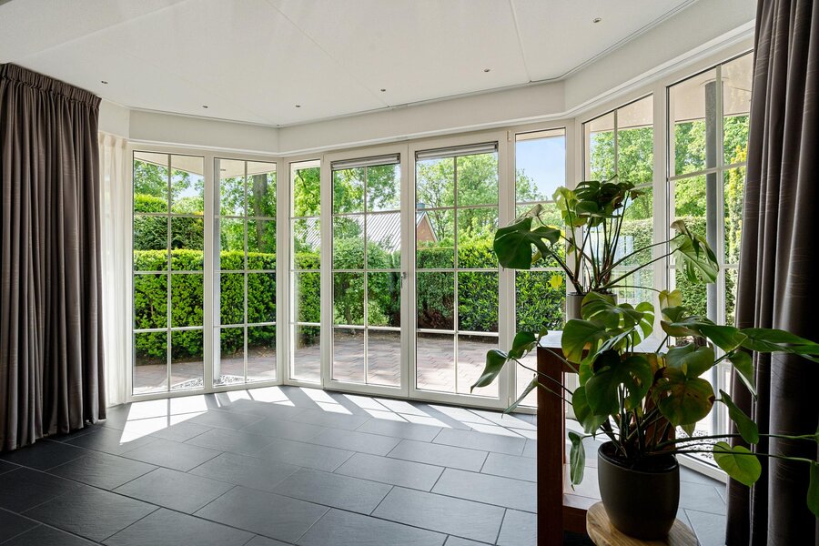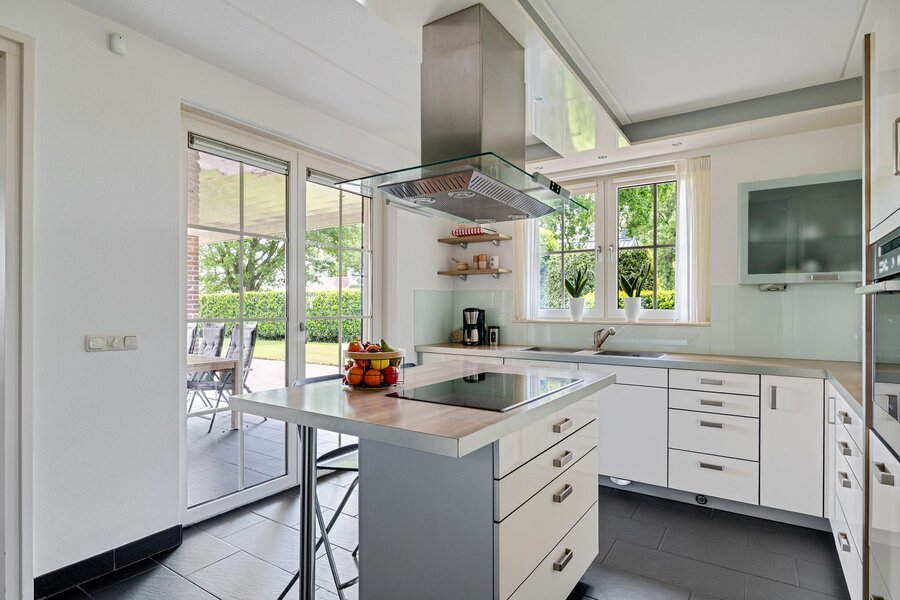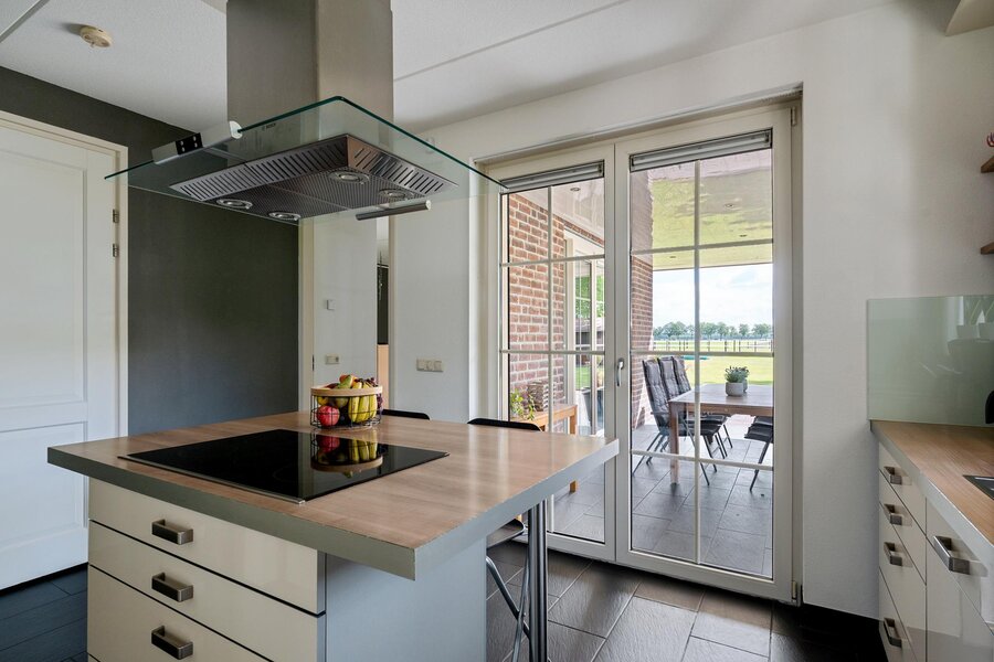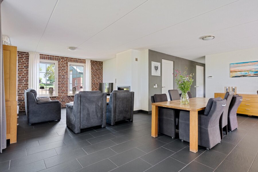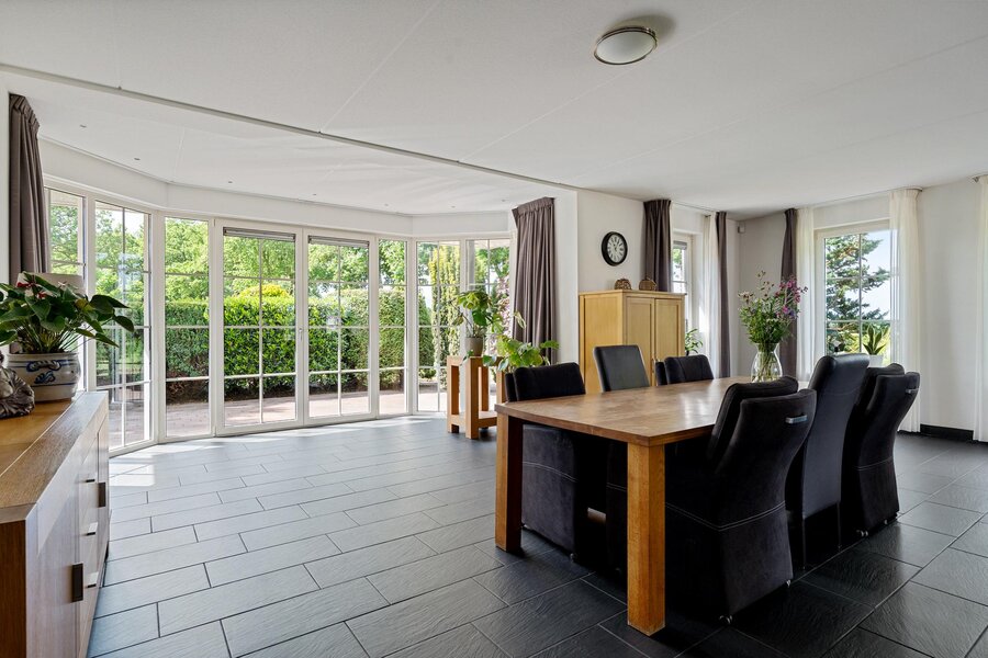 Begane grond: Entree via de hal met toilet en toegang tot de royale woonkamer. De lichte woonkamer beschikt over een sfeervolle haard en een prachtige glazen erker met openslaande deuren naar de tuin. Aangrenzend bevindt zich de moderne keuken, uitgerust met een kookeiland met inductiekookplaat, combi-oven, koelkast en vaatwasser. Vanuit de keuken is er toegang tot een ruime slaapkamer met badkamer en suite, voorzien van douche en wastafel. De keuken en slaapkamer hebben beiden openslaande deuren naar het overdekt terras.