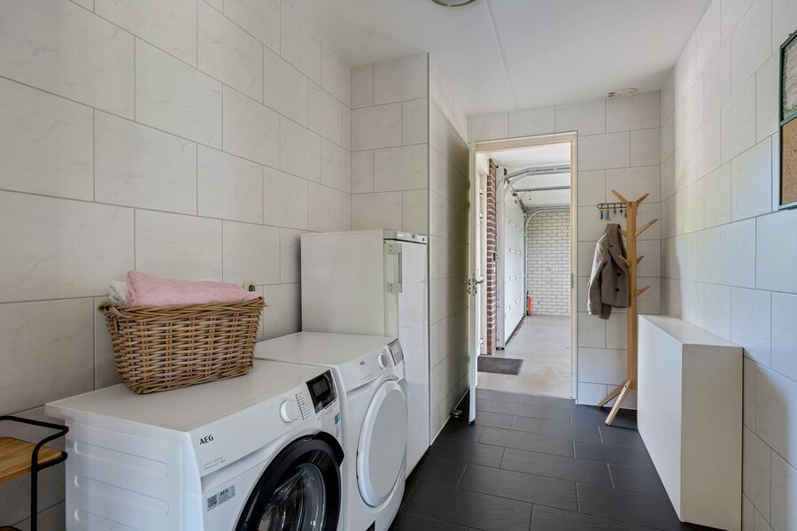 Tevens toegang tot de bijkeuken met aansluitingen voor witgoed en een extra berging/voorraadkast. Vanuit de bijkeuken is er een interne toegang tot de garage.