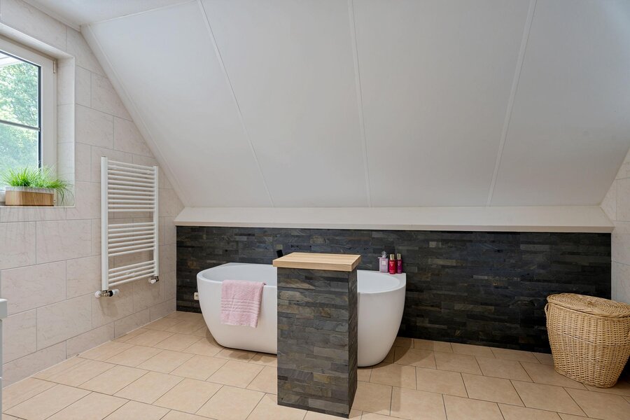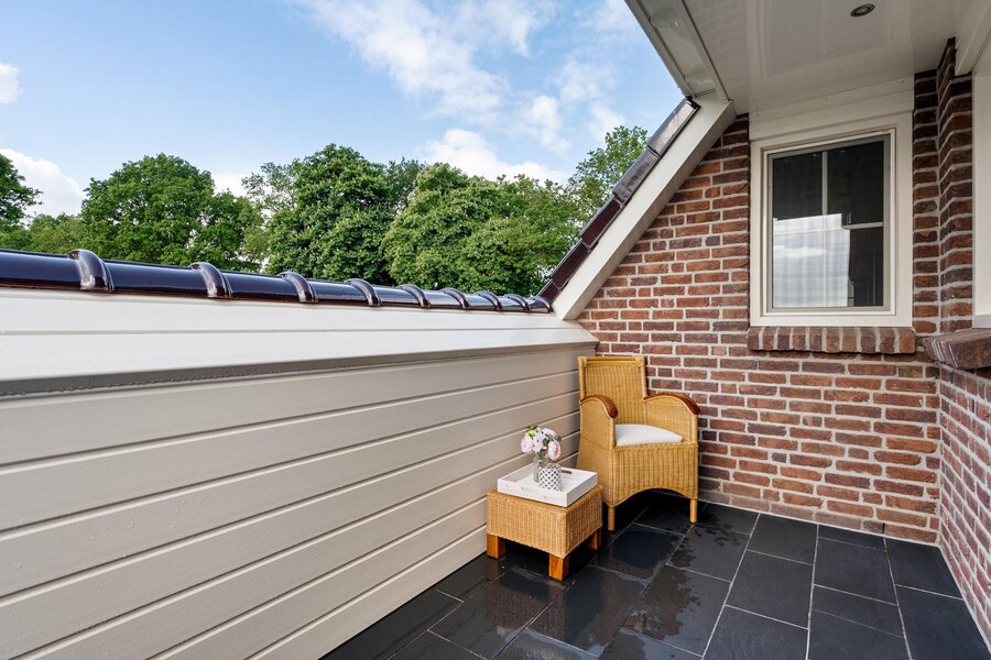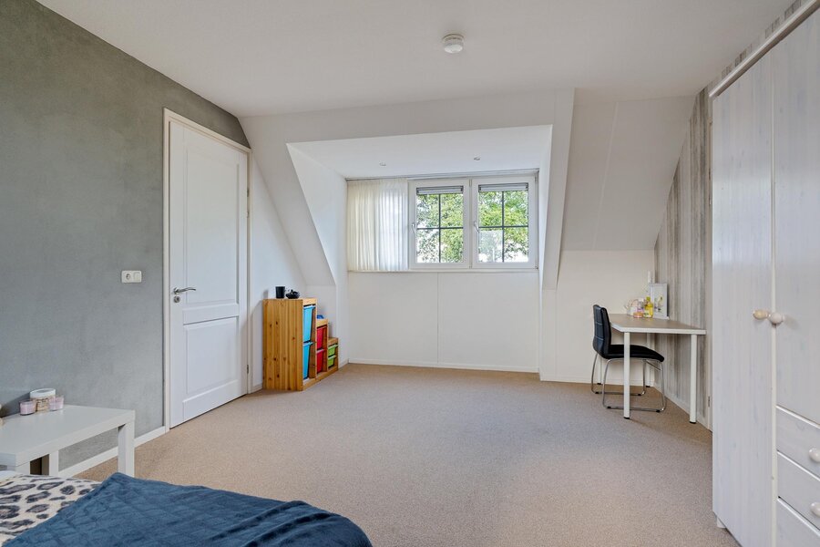 Eerste verdieping: Ruime overloop met berging en een separaat toilet. De badkamer is ingericht met een ligbad, dubbele wastafel en een inloopdouche. Vier royale slaapkamers, waarvan één met toegang tot een balkon. Zolder: Ruime bergzolder, bereikbaar via een vlizotrap.
