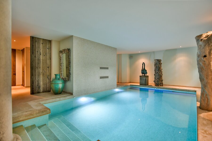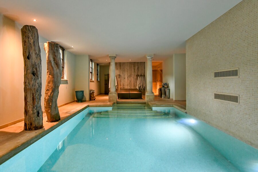 The basement is a true wellness oasis with a swimming pool, sauna, and lounge—a place to completely unwind.