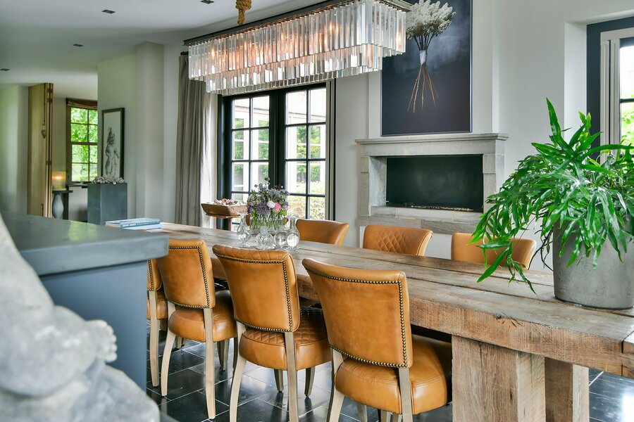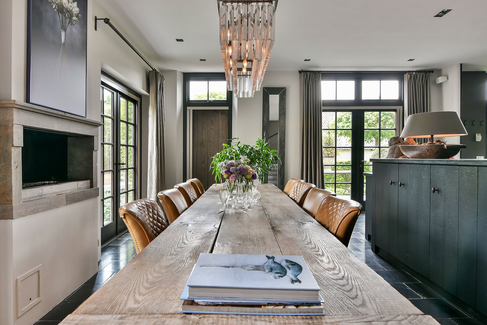 The interior features spacious, bright living areas. The side entrance leads to a generous hallway with a cloakroom and a modern toilet. The heart of the home is the luxurious kitchen/diner, equipped with a cooking island, concrete countertop with integrated sink, high-quality built-in appliances, and an atmospheric gas fireplace. French doors connect the kitchen to the private, beautifully landscaped garden with several terraces.