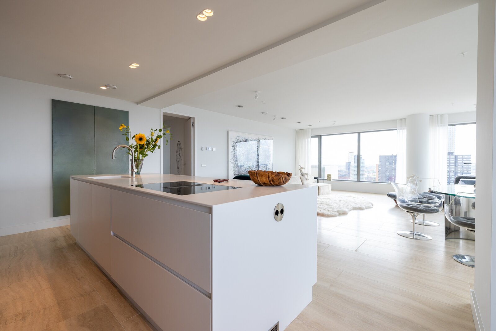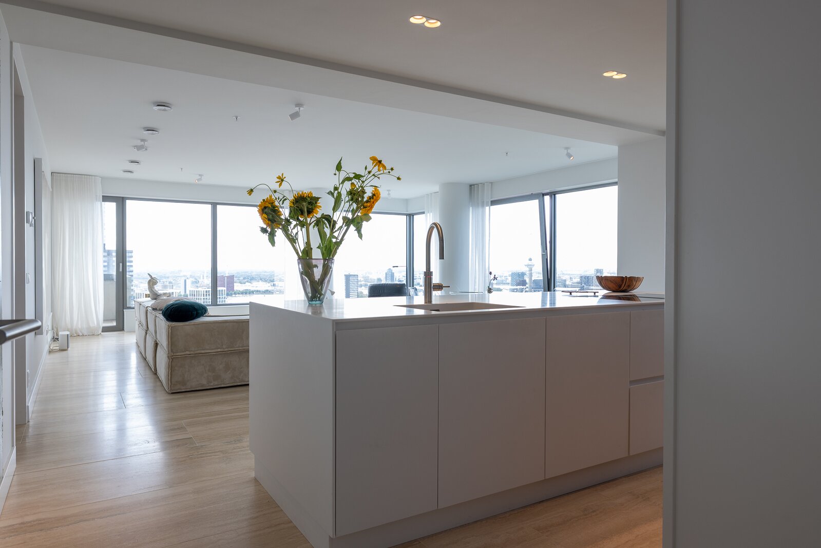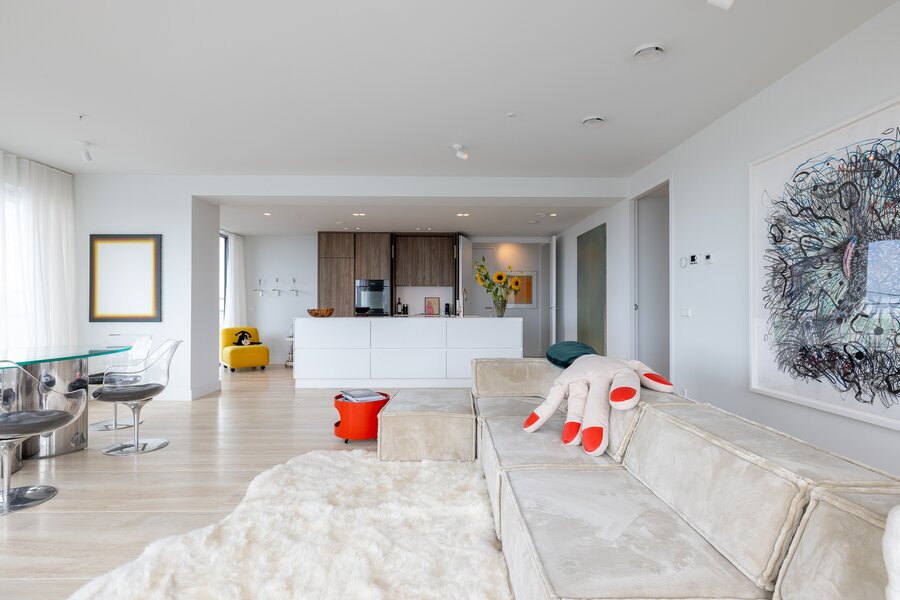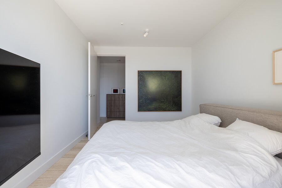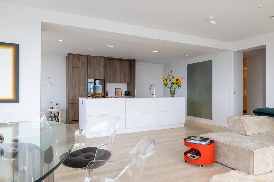 Dankzij de ligging op de hoek en de verdiepingshoge raampartijen is het appartement uitzonderlijk licht en ruimtelijk. De indeling is doordacht en comfortabel met onder andere een royale living, een luxe keuken met kookeiland, een werkkamer, twee slaapkamers en een badkamer die aan alle moderne eisen voldoet. De buitenruimte bestaat uit twee zonnige terrassen met toegang vanuit zowel de woonkamer als de werkkamer – perfect gepositioneerd om te genieten van middag- en avondzon én van het dynamische uitzicht op de stad.
