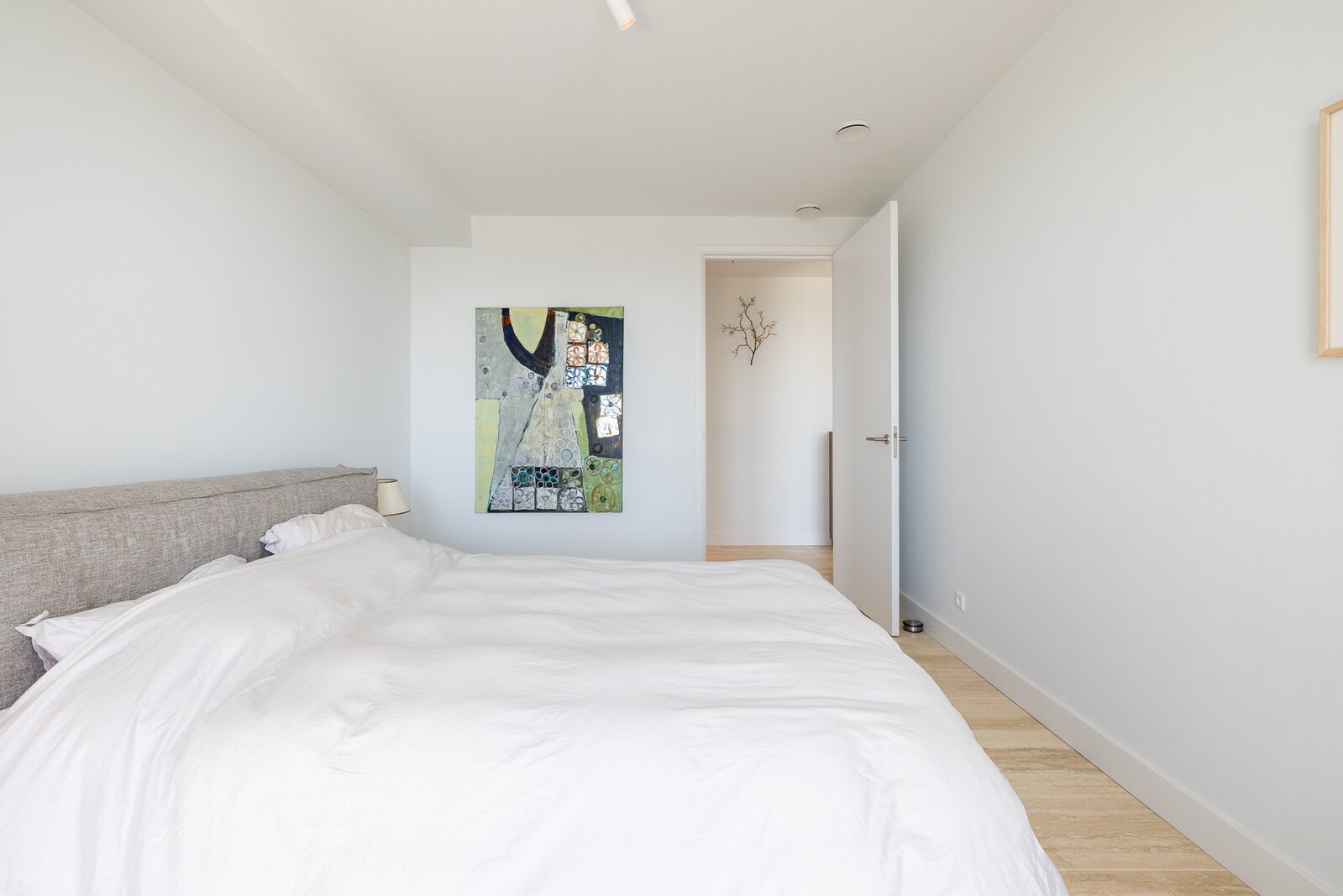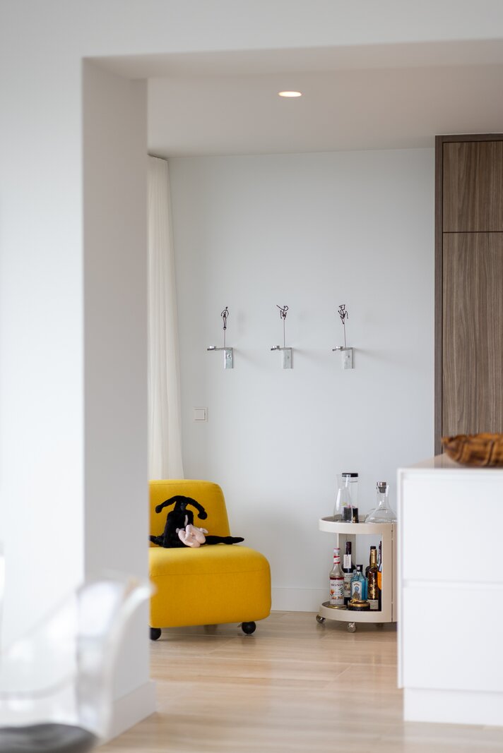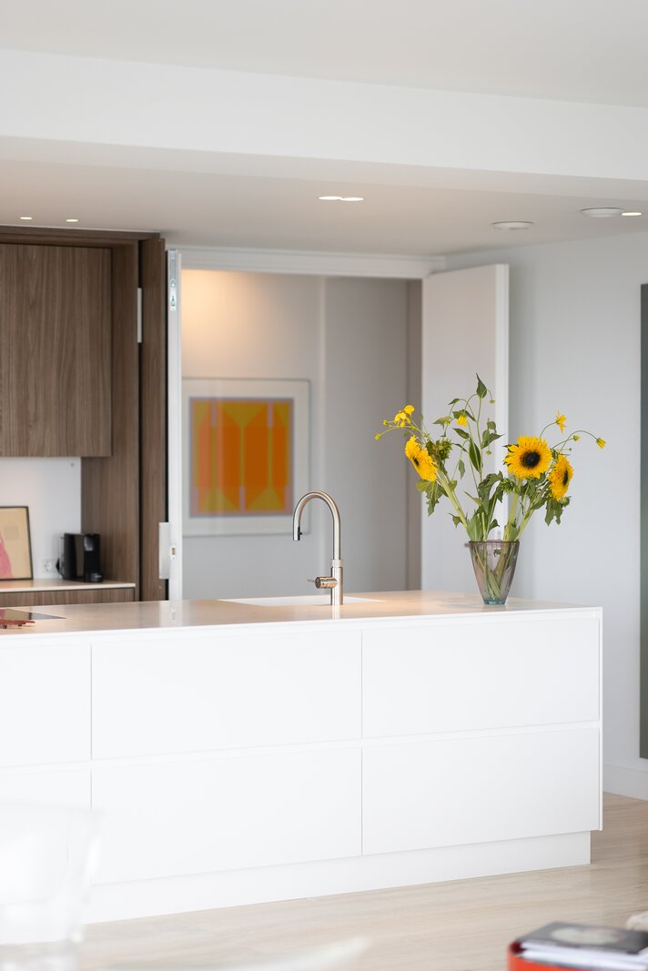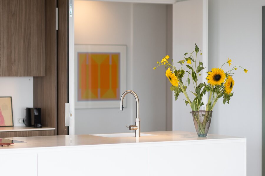 Dankzij de ligging op de hoek en de verdiepingshoge raampartijen is het appartement uitzonderlijk licht en ruimtelijk. De indeling is doordacht en comfortabel met onder andere een royale living, een luxe keuken met kookeiland, een werkkamer, twee slaapkamers en een badkamer die aan alle moderne eisen voldoet. De buitenruimte bestaat uit twee zonnige terrassen met toegang vanuit zowel de woonkamer als de werkkamer – perfect gepositioneerd om te genieten van middag- en avondzon én van het dynamische uitzicht op de stad.
