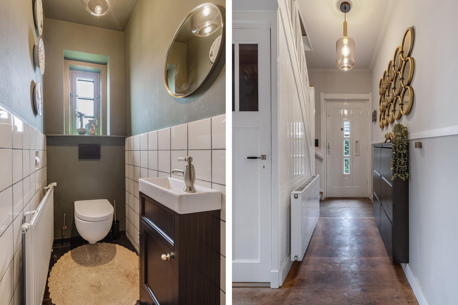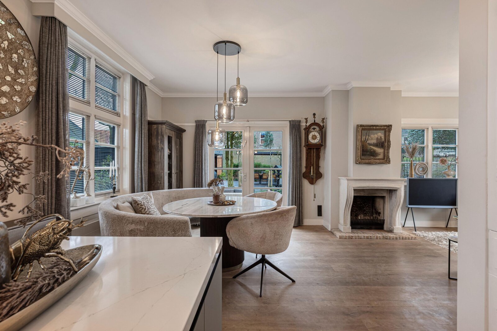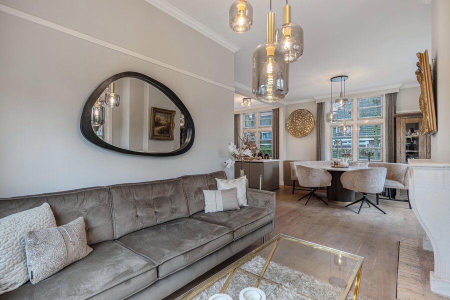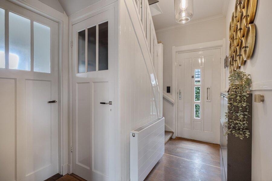 Hal, modern zwevend toilet, ruime provisiekelder, sfeervolle L-vormige woonkamer met mooie houten parketvloer en openslaande deuren naar de achtertuin. De woonkamer is tevens voorzien van een open haard met fraaie schouw.
