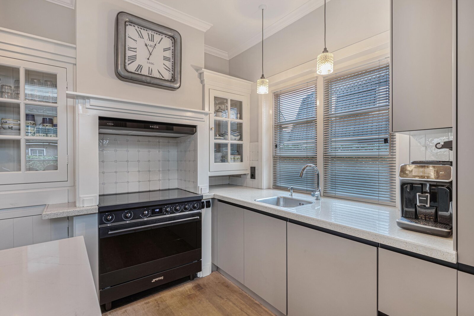 Aan de voorzijde van de woning is de open keuken uit 2024 met eiland. De keuken beschikt over een groot inductie SMEG fornuis, afzuiginstallatie, oven, magnetron, koel/vriescombinatie combinatie en een vaatwasser.