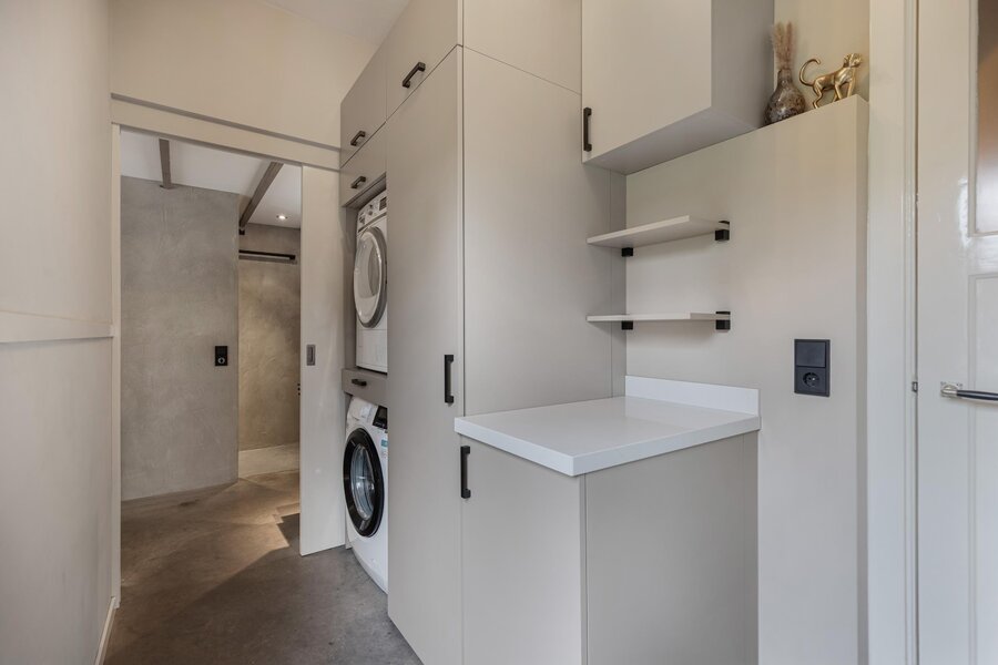 In de bijkeuken is er een aansluiting voor de wasmachine en droger en een doorloop naar de uitbouw van de woning waar een prachtige slaap-/werkkamer met vide en een moderne badkamer met douche, wastafelmeubel en toilet, zich bevinden.