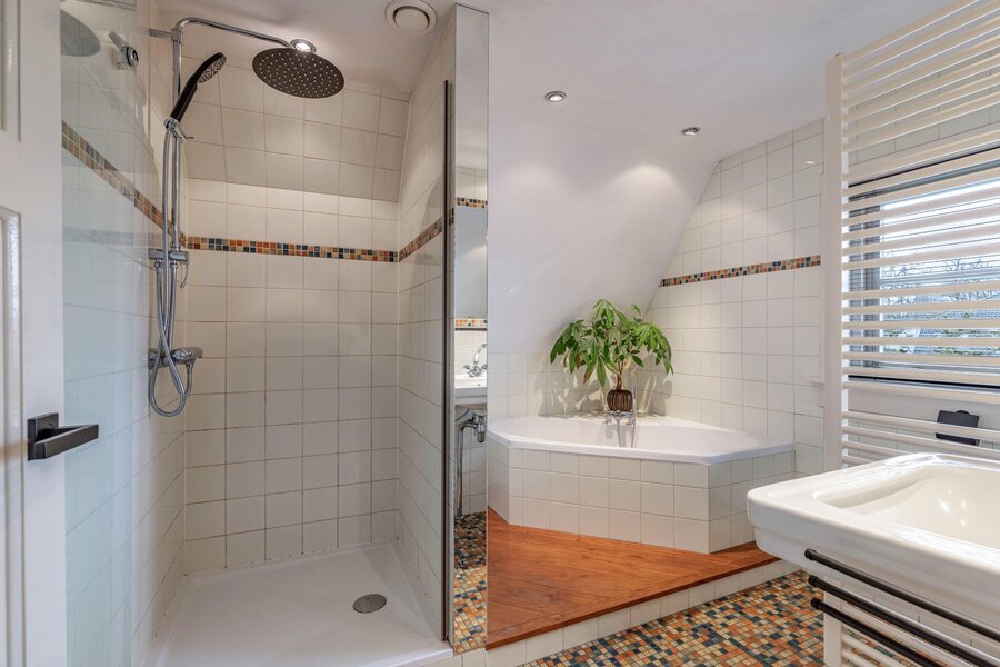 Ruime overloop met een slaap/werkkamer, twee ruime slaapkamers, grote complete tweede badkamer met douche, ligbad, wastafel en toilet.
