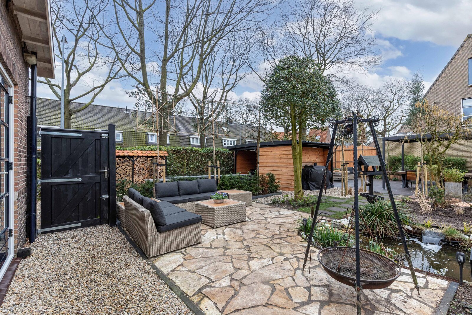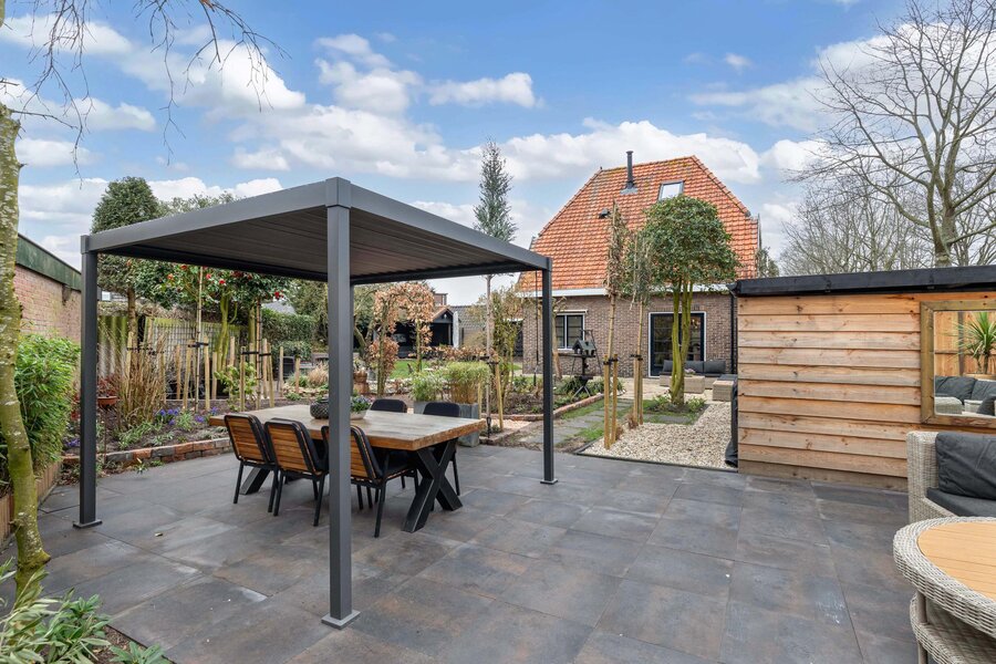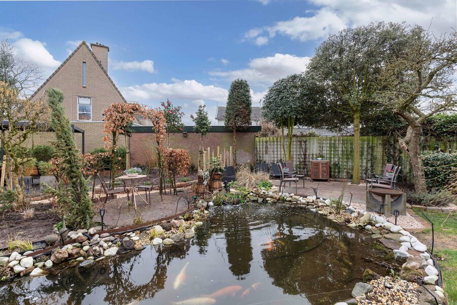 - prachtig nieuw aangelegde en zonnige tuin op het zuidwesten met diverse terrassen en mooie vijver.