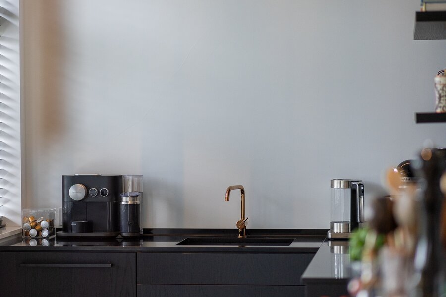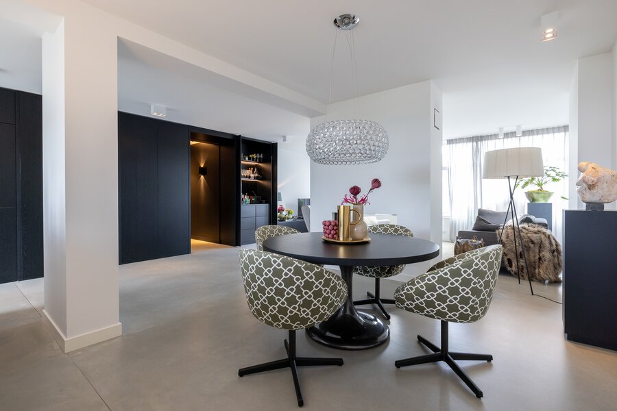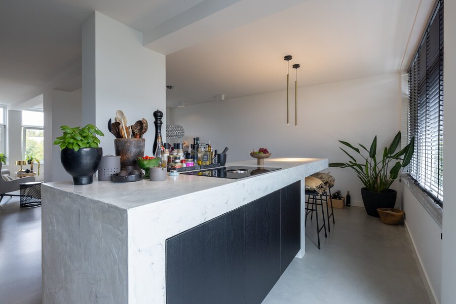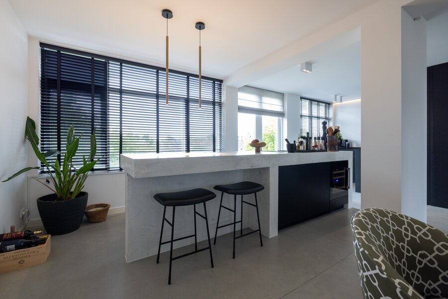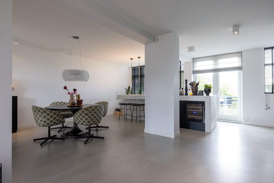 De zeer ruime en moderne woon-/eetkamer is bereikbaar vanuit de gang en is over de volle diepte van het appartement gesitueerd. De ruimte is voorzien van vaste kasten, een gietvloer en toegang naar het achtergelegen 2e balkon. De keukenruimte is voorzien van een modern kookeiland en een hoek-wandmeubel en inbouwapparatuur.