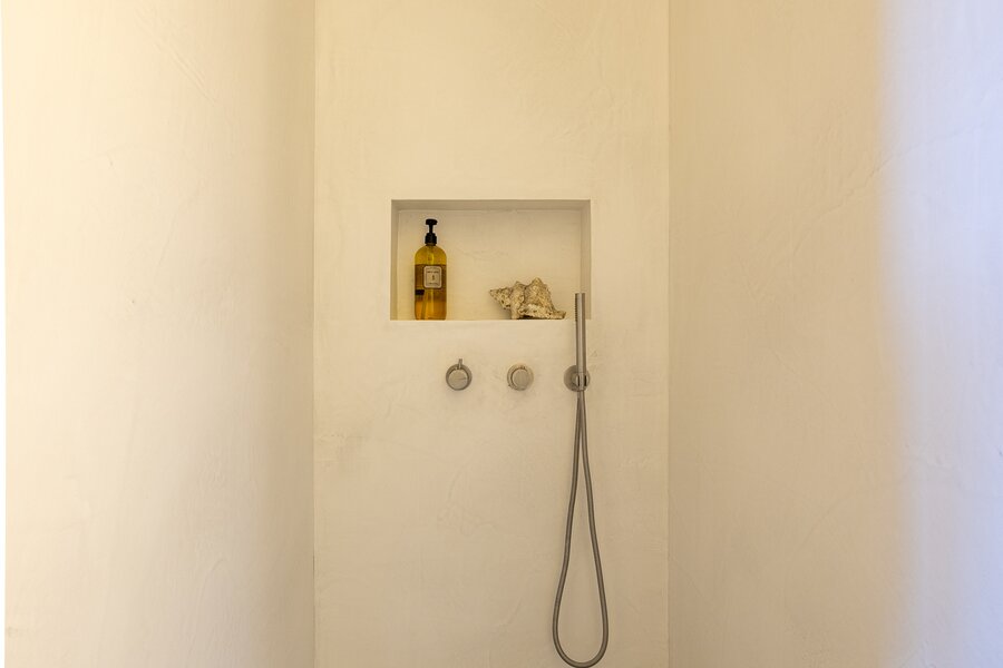 Entrance hallway with a modern toilet and laundry area with washing machine connections. From the hallway, a second bathroom can be accessed, equipped with a walk-in shower and washbasin. The three bedrooms are also accessible from the hallway, two of which are located at the front. One of these includes a built-in wardrobe. The master bedroom, situated at the rear, features a walk-in wardrobe and an en-suite bathroom with a spacious walk-in shower, double washbasin, and private toilet. This bedroom also provides access to a rear-facing balcony.