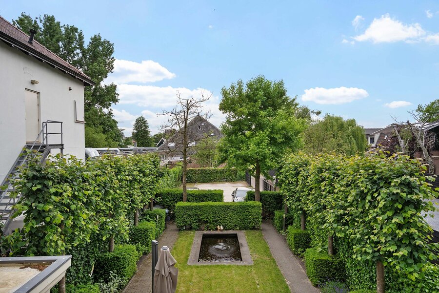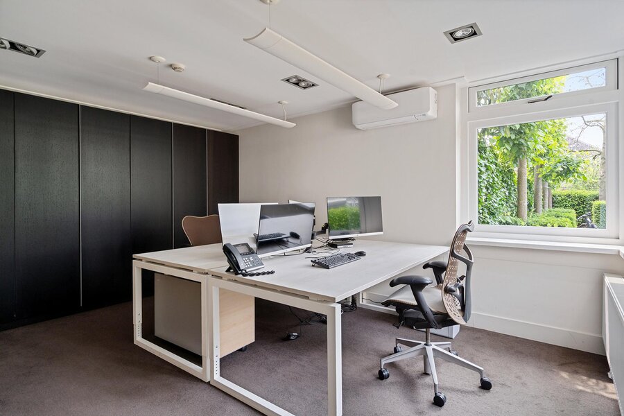 Parterre: voortuin, entree, zeer royale ontvangstruimte met trapopgang naar de verdieping, stijlvolle sanitaire voorzieningen, 3 kantoorkamers, moderne keuken met inbouwapparatuur en zicht op de fraai aangelegde tuin;