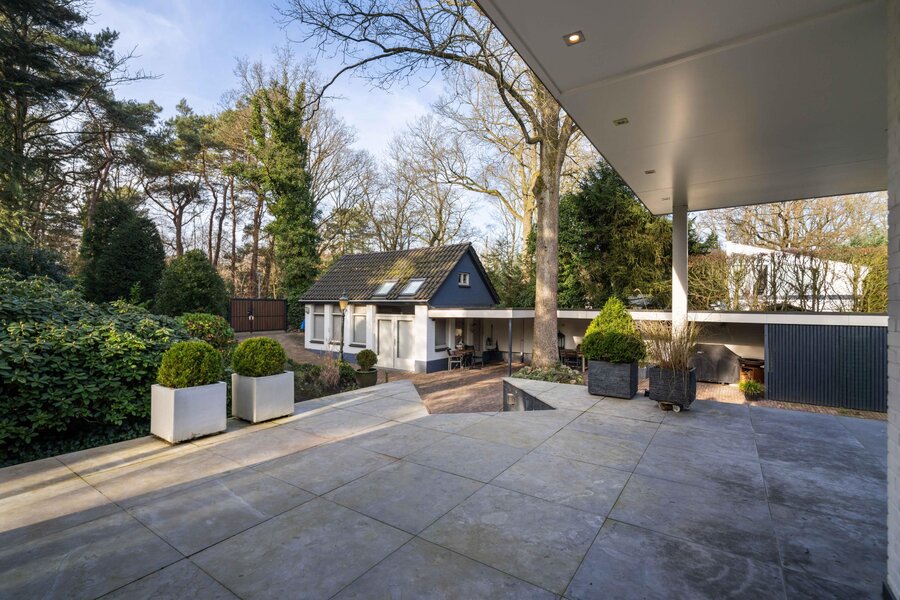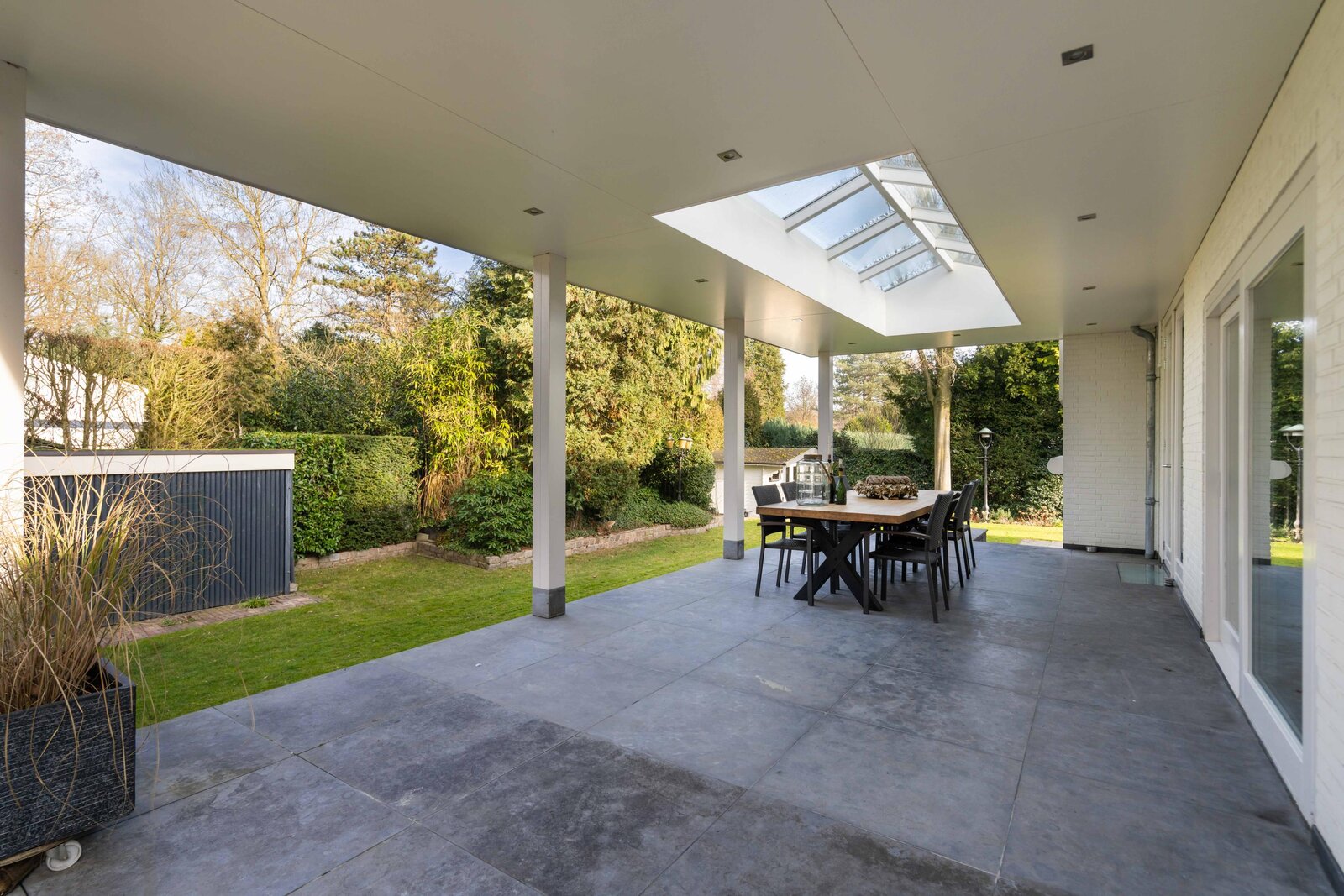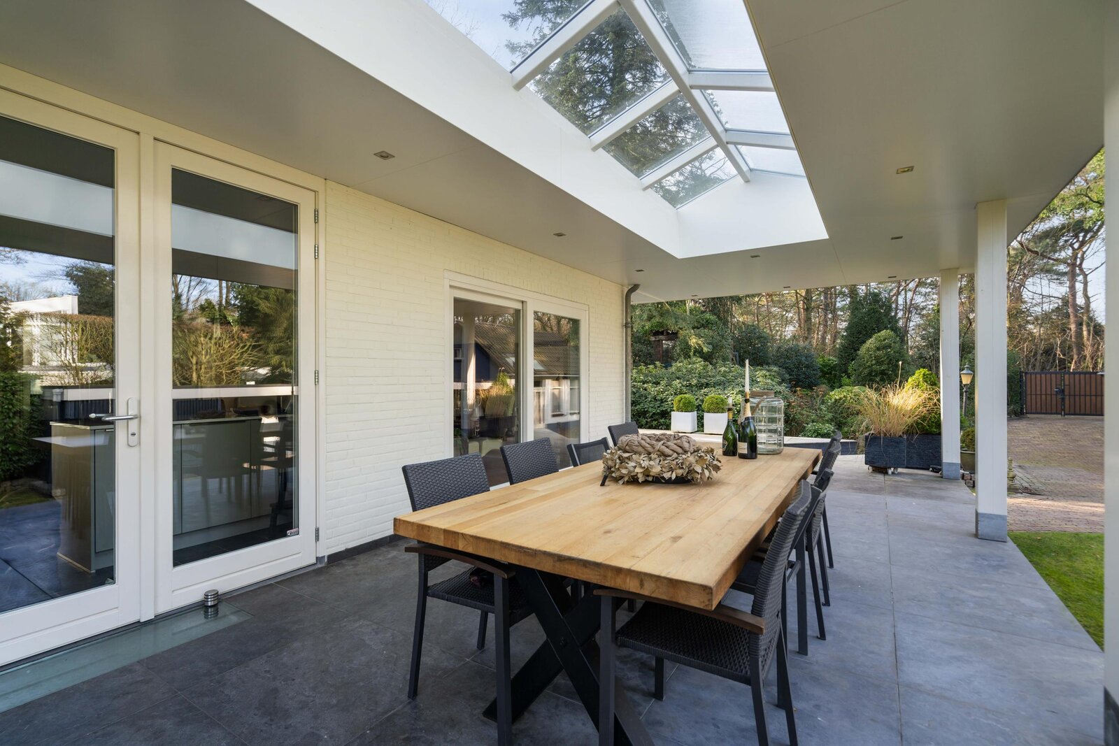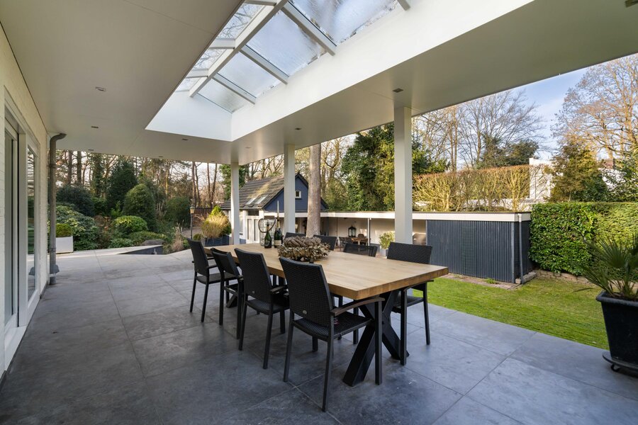 Vanuit de woonkamer en keuken is er toegang tot het overdekt terras. Het fraaie overdekt terras is afgewerkt met tegels en voorzien van dak- en vloerisolatie waardoor er voorbereidingen aanwezig zijn voor het realiseren van een tuinkamer of voor een uitbreiding van de woning. Het terras biedt voldoende ruimte voor een grote loungeset of eethoek. Vanuit het terras is er een prachtig zicht op de tuin. Via een aantal treden is er toegang tot de lager gelegen tuin.