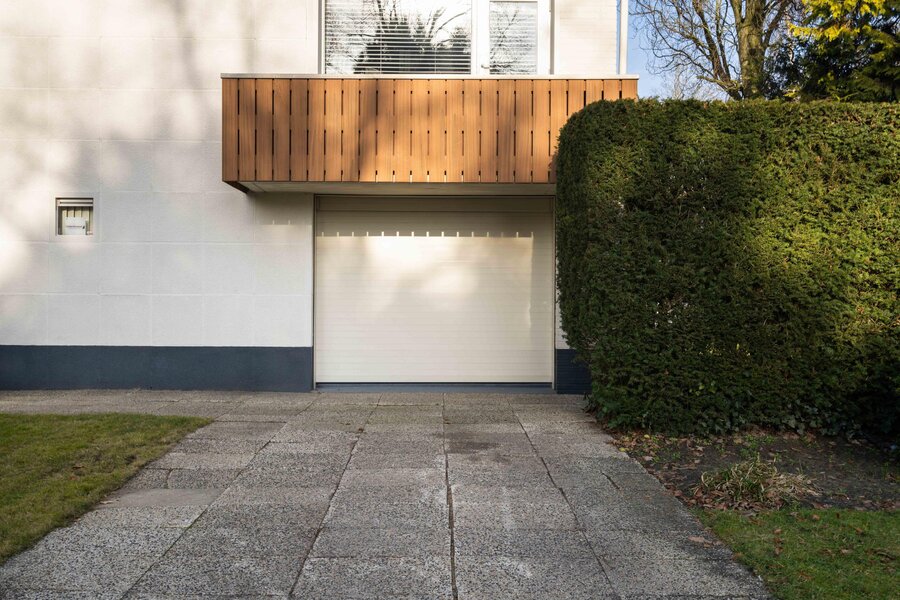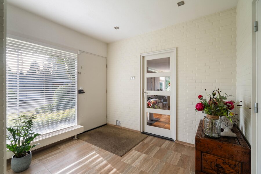Vanuit de straatzijde is er via de oprit en een aantal treden toegang tot de verhoogde overdekte entree aan de voorzijde van de woning.