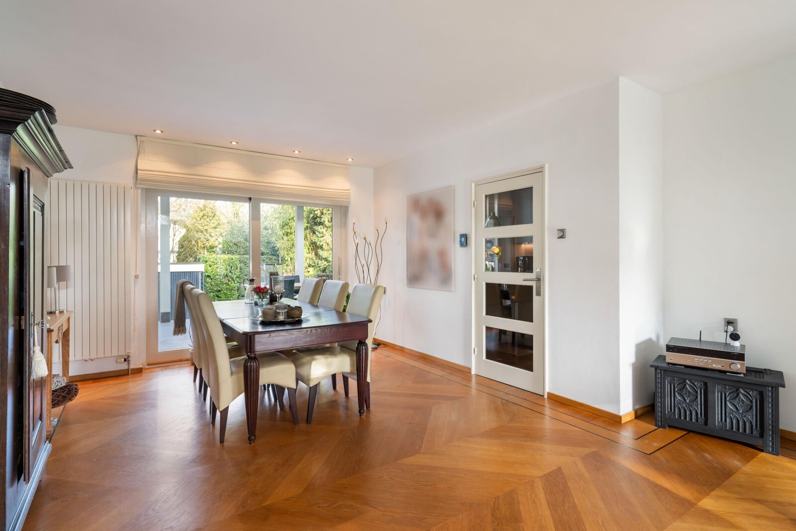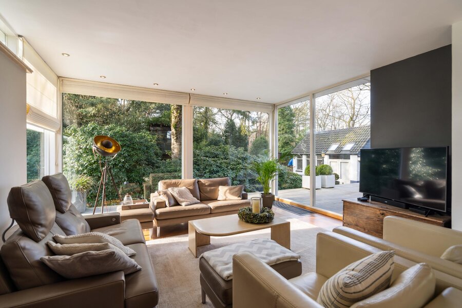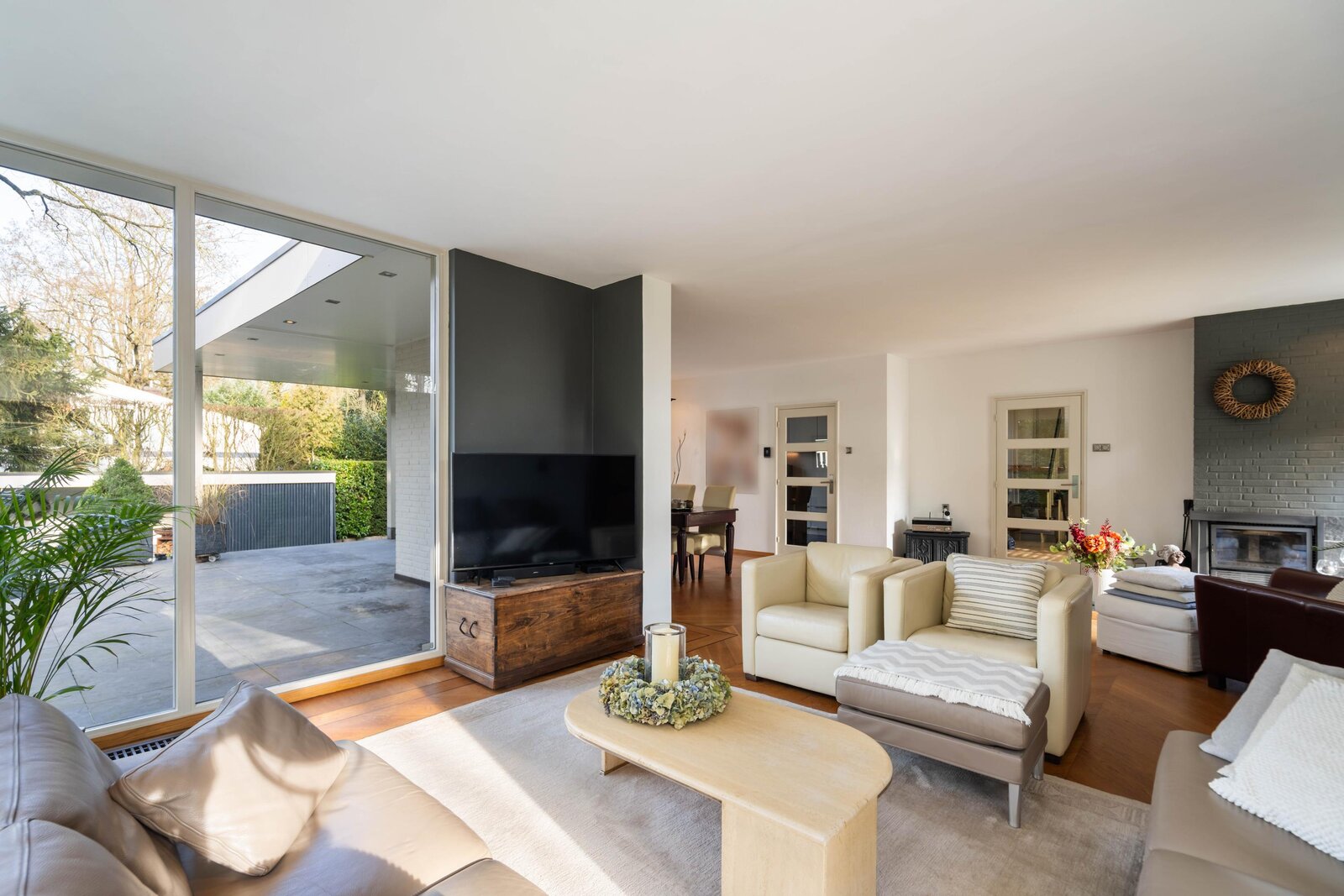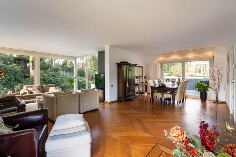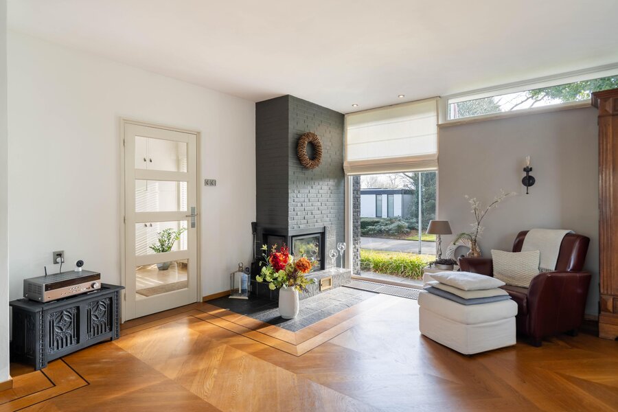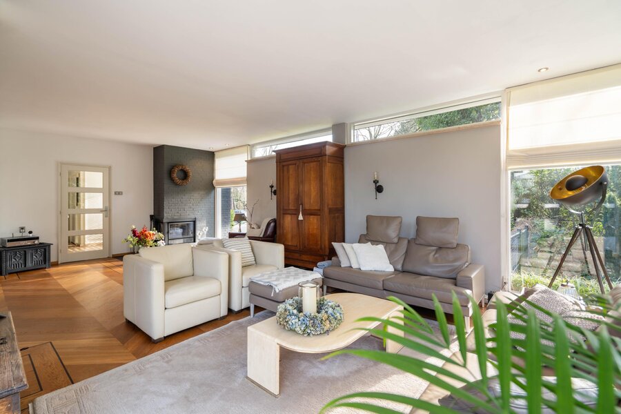 De woonkamer bestaat uit een ruim zitgedeelte, eetgedeelte en een leesgedeelte. De woonkamer is afgewerkt met een stijlvolle houten parketvloer in 'Hongaarse punt' motief met bies en is voorzien van een sfeervolle houtgestookte haardpartij en diverse inbouwspots. Via een grote schuifpui is er toegang tot het overdekte terras en de tuin. De vele, deels kamerhoge grote raampartijen en schuifpui zorgen voor veel lichtinval en een prachtig contact met de tuin en bosrijke omliggende omgeving. Vanuit het eetgedeelte is er toegang tot de keuken.