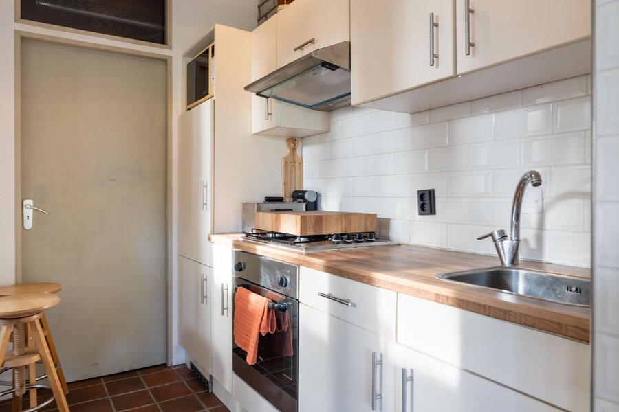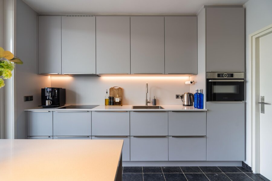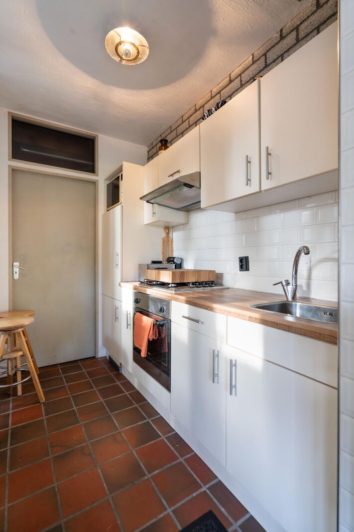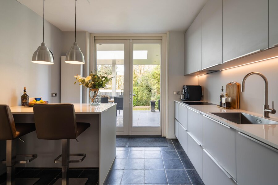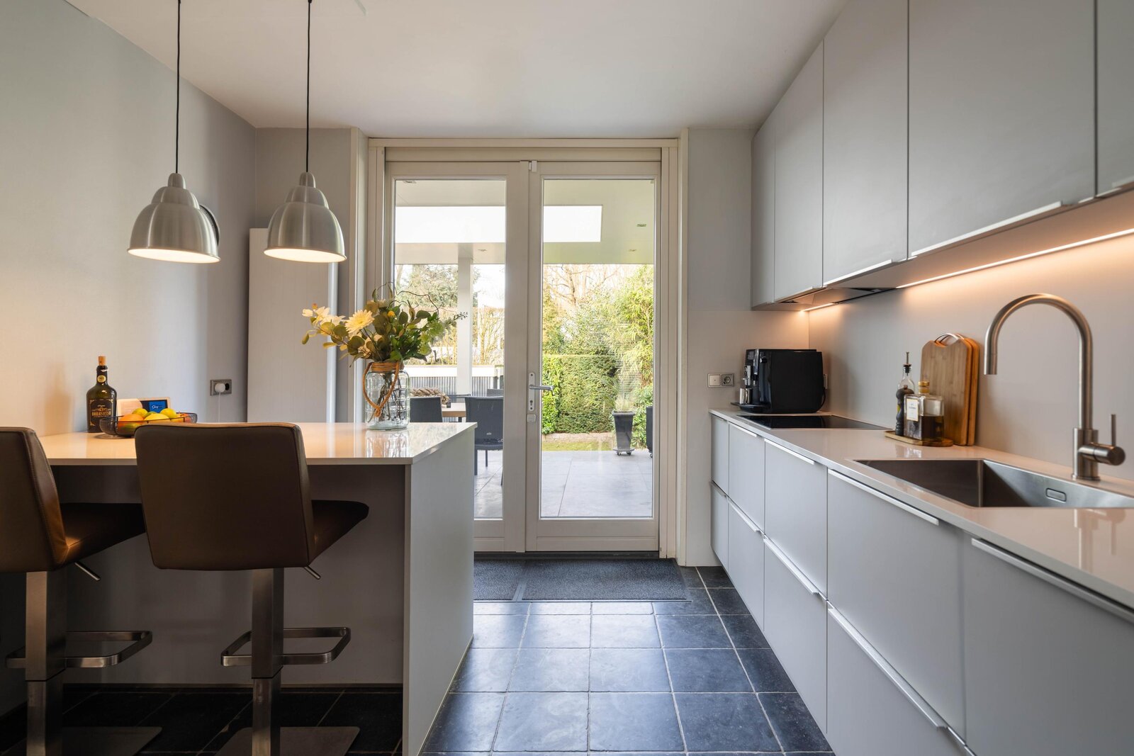 De keuken is afgewerkt met een tegelvloer, beschikt over een vast (eet)eiland en is voorzien van een moderne wandopstelling (2024), bestaande uit diverse boven- en onderkasten, lades en een werkblad met spoelbak en inductiekookplaat. De keuken beschikt verder over een afzuigkap, combi-oven, een vaatwasser en een losse koel-vriescombinatie. Vanuit de keuken zijn de hal en het overdekt terras toegankelijk. Het terras is toegankelijk via openslaande deuren met rolhorren.