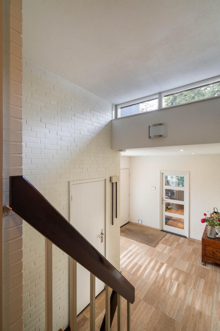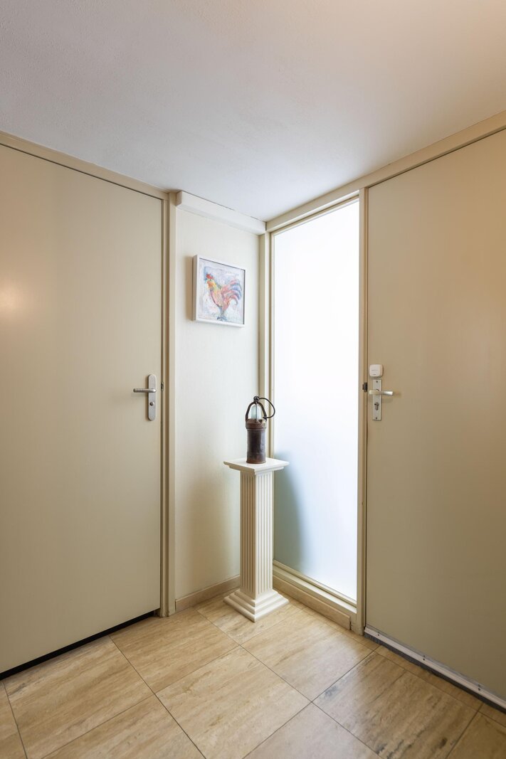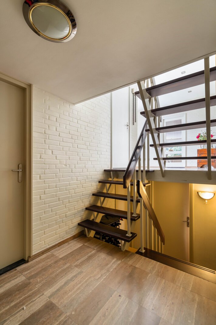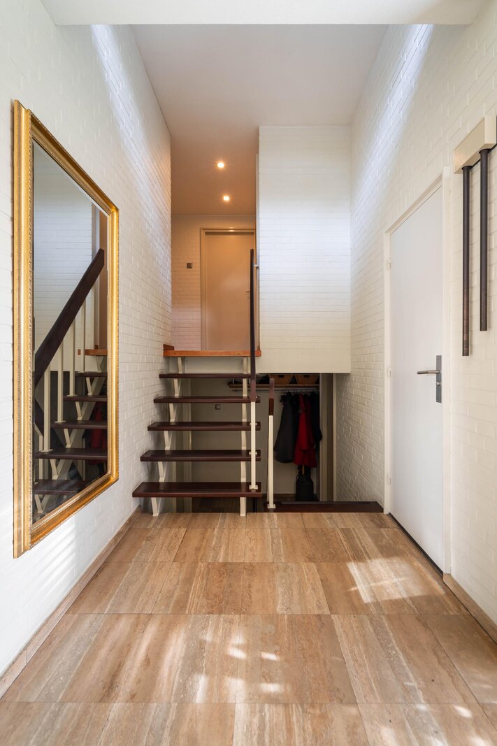 Ruime ontvangsthal met meterkast en toiletruimte. De hal is afgewerkt met een travertin vloer. Vanuit de hal zijn de woonkamer, keuken en trappartijen naar de verdieping en het souterrain toegankelijk.