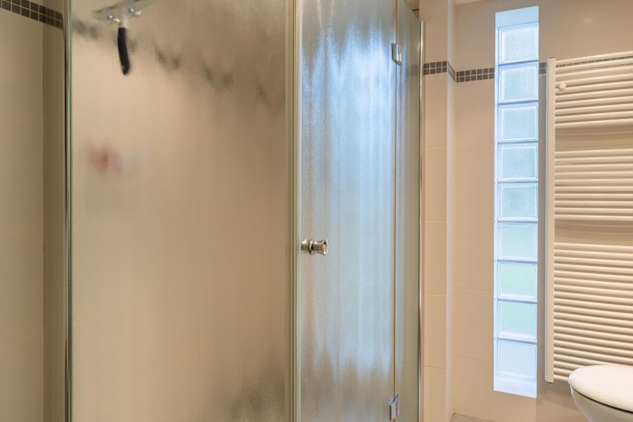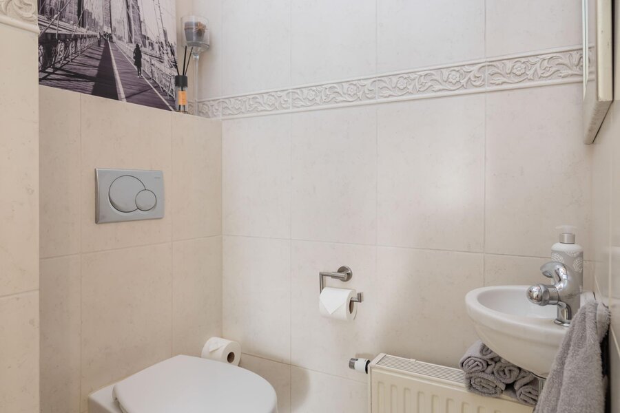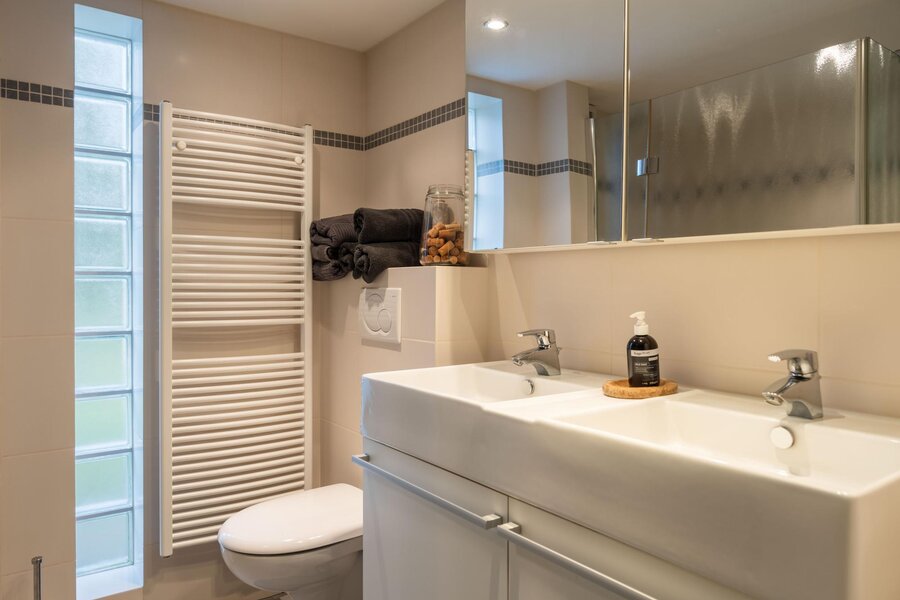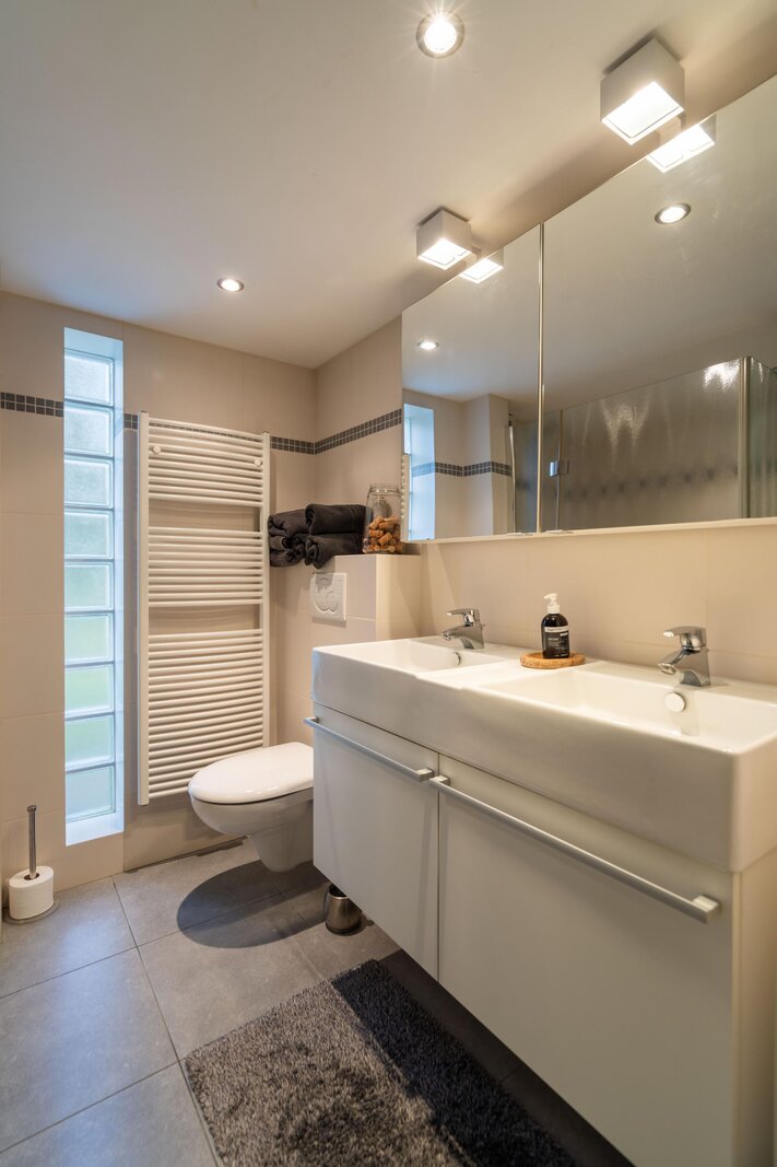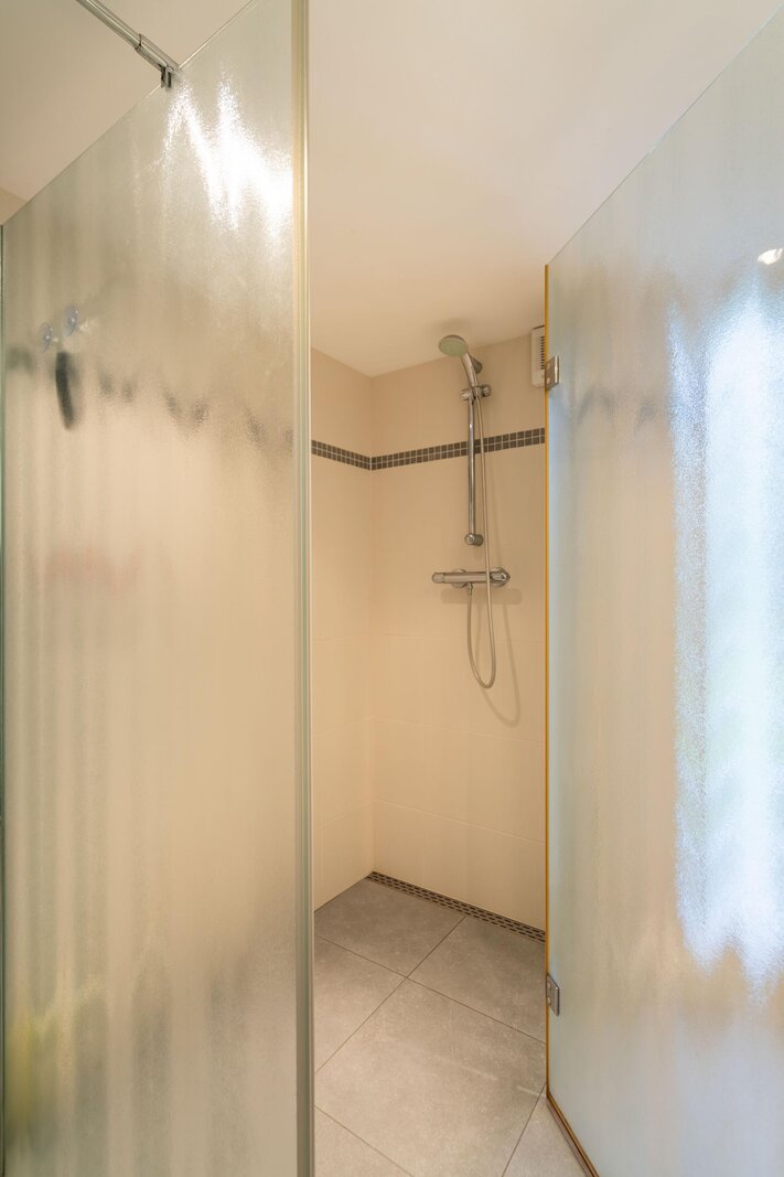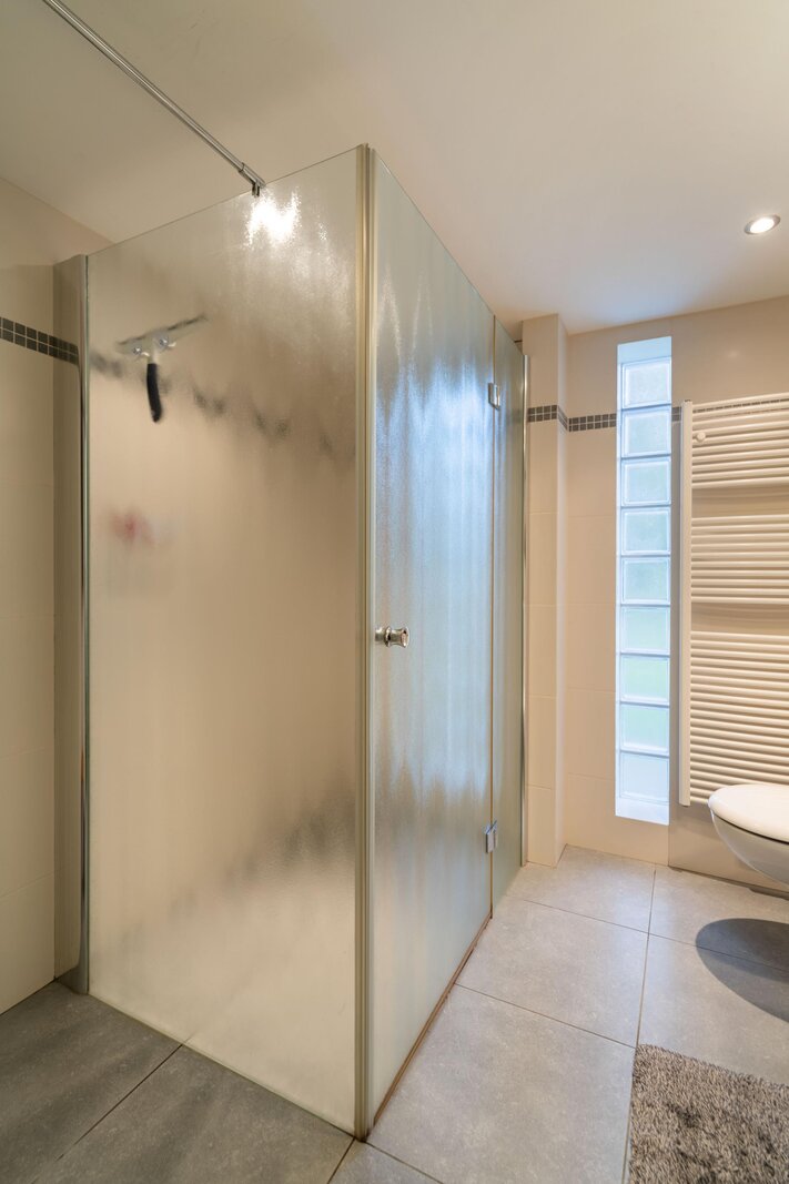 Ruime, geheel betegelde extra badkamer met een grote inloopdouche, een toilet en een dubbele wastafel met een modern bijbehorend wastafelmeubel en een spiegelkast met verlichting. De inloopdouche is voorzien van een glazen deur en beschikt over een draingoot, een thermostaatkraan en een glijstang met handdouche. Het plafond is voorzien van diverse inbouwspots. De glasbouwstenen zorgen voor een aangename daglichttoetreding.
