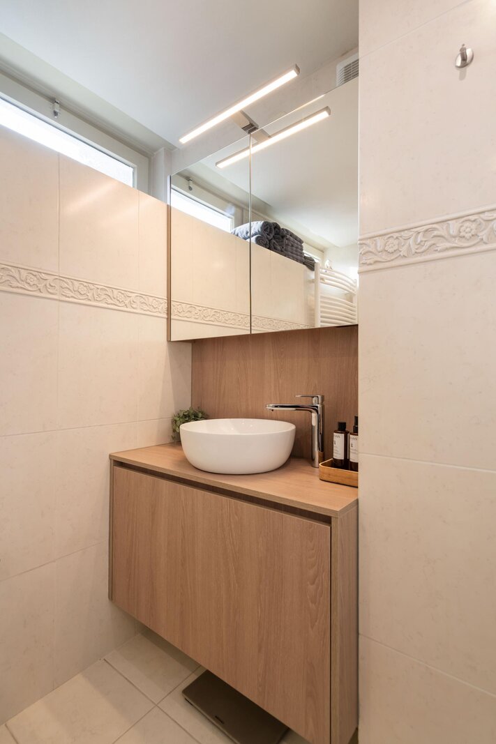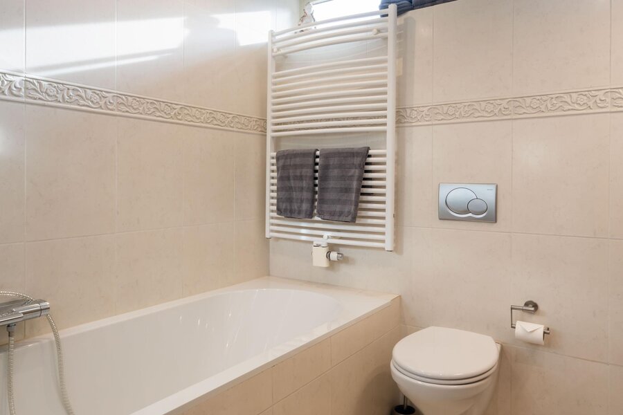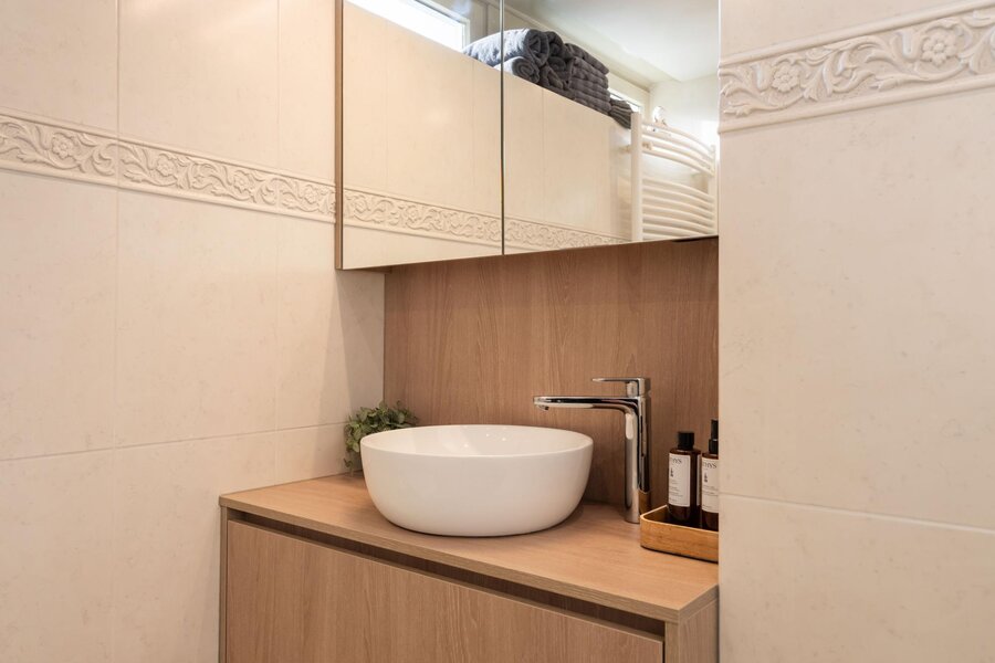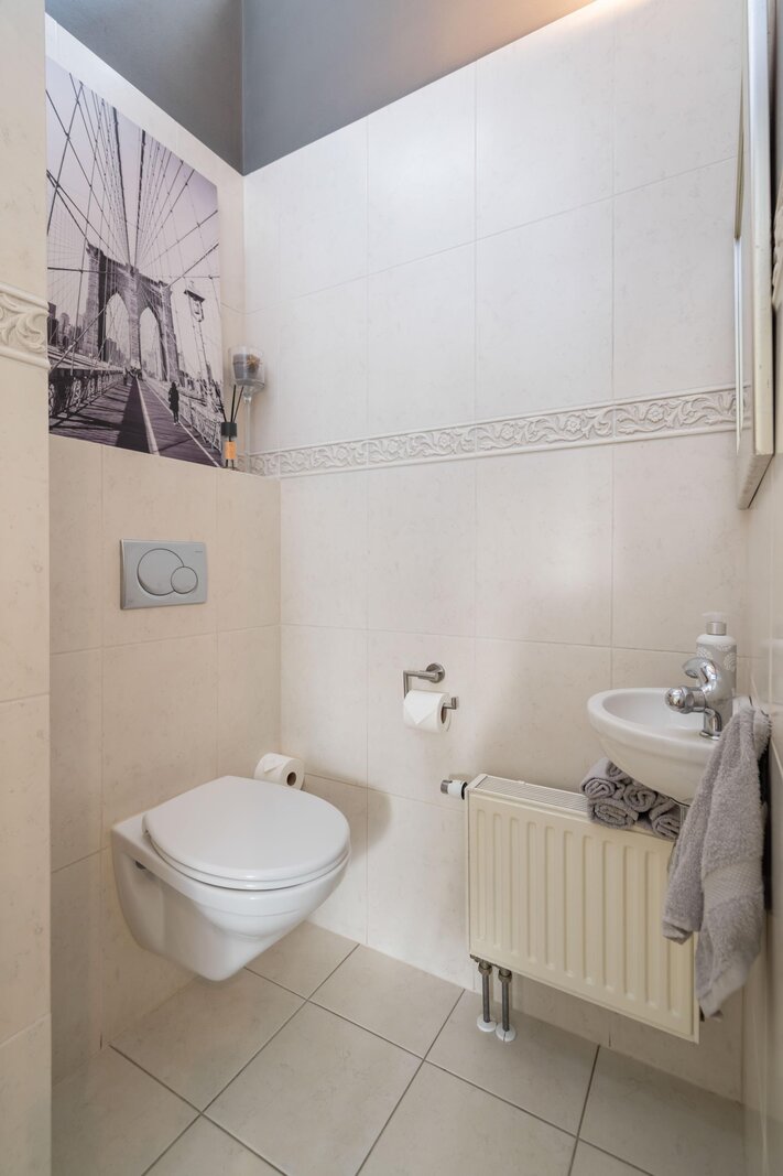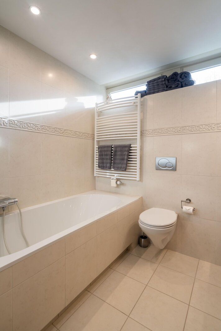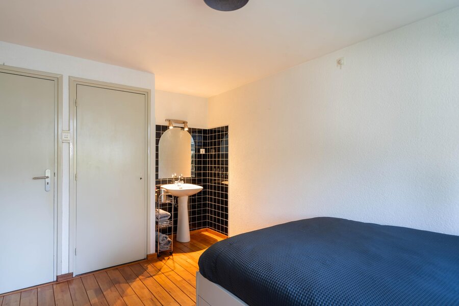Ruime, geheel betegelde extra badkamer met een grote inloopdouche, een toilet en een dubbele wastafel met een modern bijbehorend wastafelmeubel en een spiegelkast met verlichting. De inloopdouche is voorzien van een glazen deur en beschikt over een draingoot, een thermostaatkraan en een glijstang met handdouche. Het plafond is voorzien van diverse inbouwspots. De glasbouwstenen zorgen voor een aangename daglichttoetreding.