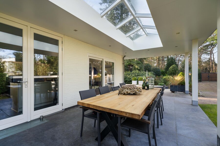 - Het overdekt terras is voorzien van vloer- en dakisolatie en heeft HR++ beglazing in de lichtstraat waardoor deze volledig is voorbereid voor het realiseren van een tuinkamer of voor een uitbreiding van de woning.