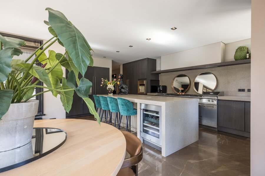 The main living level is spacious and thoughtfully designed, perfectly suited for both everyday family life and elegant entertaining. The various salons and living areas offer atmosphere, comfort, and refinement, while the kitchen forms the true heart of the home: generous, stylish, and designed for long dinners with family and guests. Every detail has been considered, including two dishwashers and a touchscreen faucet, reflecting the villa’s high-end level of finish.