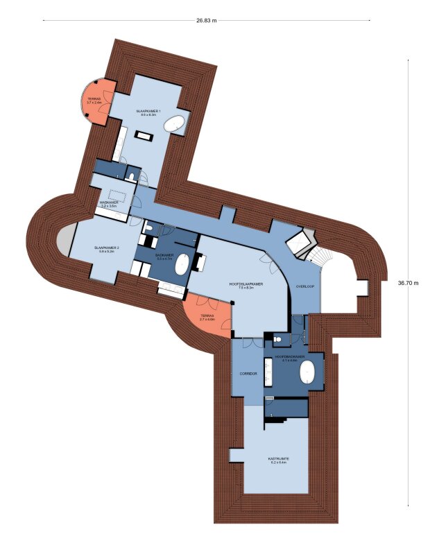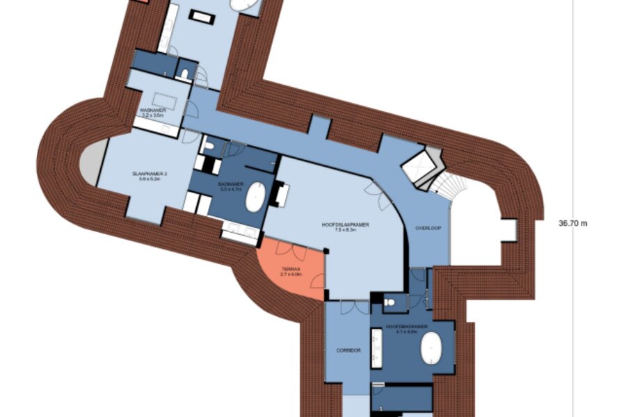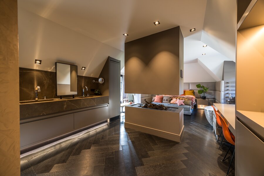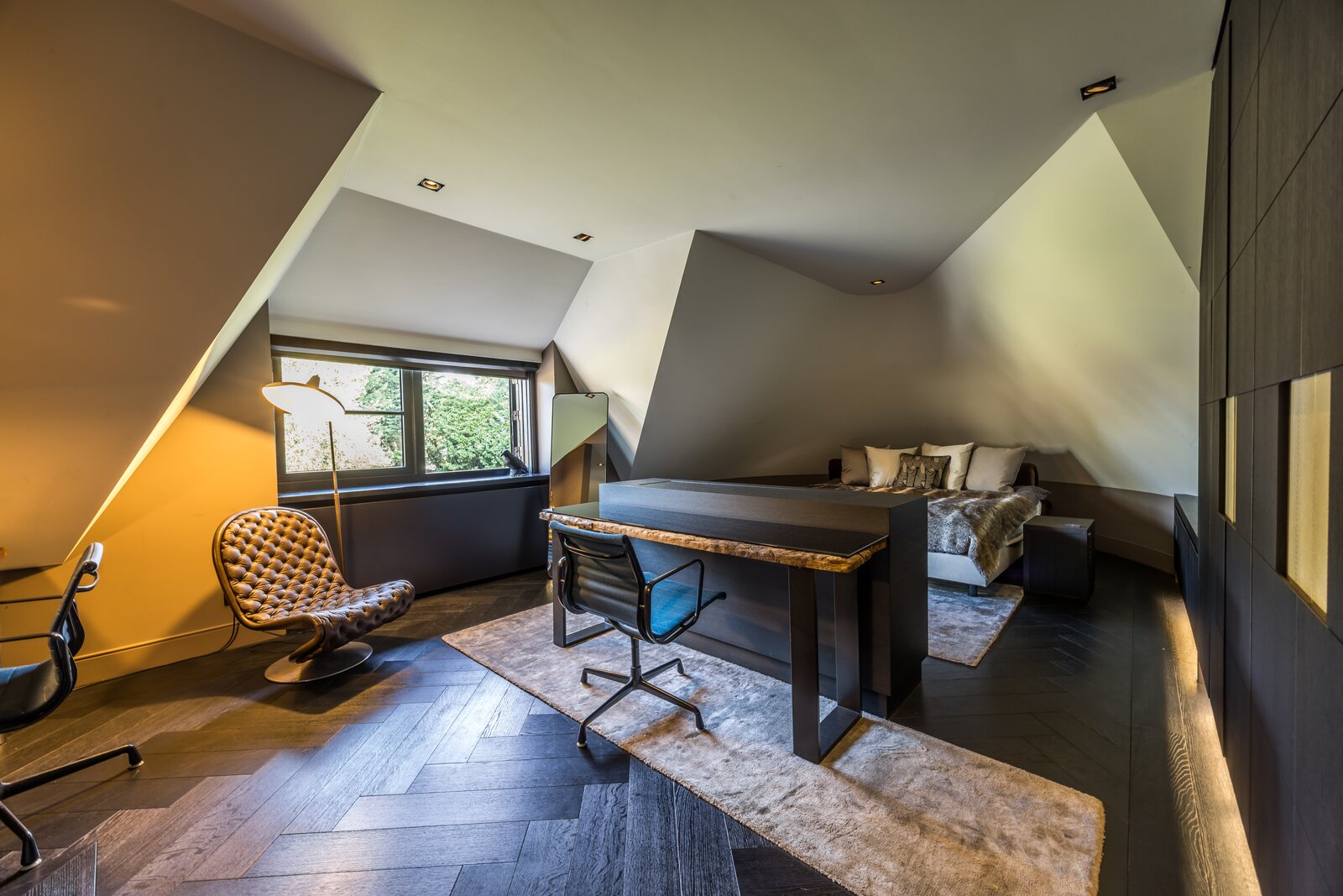 The upper floors accommodate several spacious suites, bathrooms, and dressing areas. The master suite is particularly impressive, featuring a large bathroom, dressing room, and bespoke elements throughout. Within this private domain, exceptional features such as a walk-in closet, luxurious sanitary facilities, and even an integrated panic room ensure that comfort and security are brought together at the highest level. The entire layout is designed for comfortable family living, relaxed guest accommodation, and a residential experience centered around space, tranquility, and refinement.