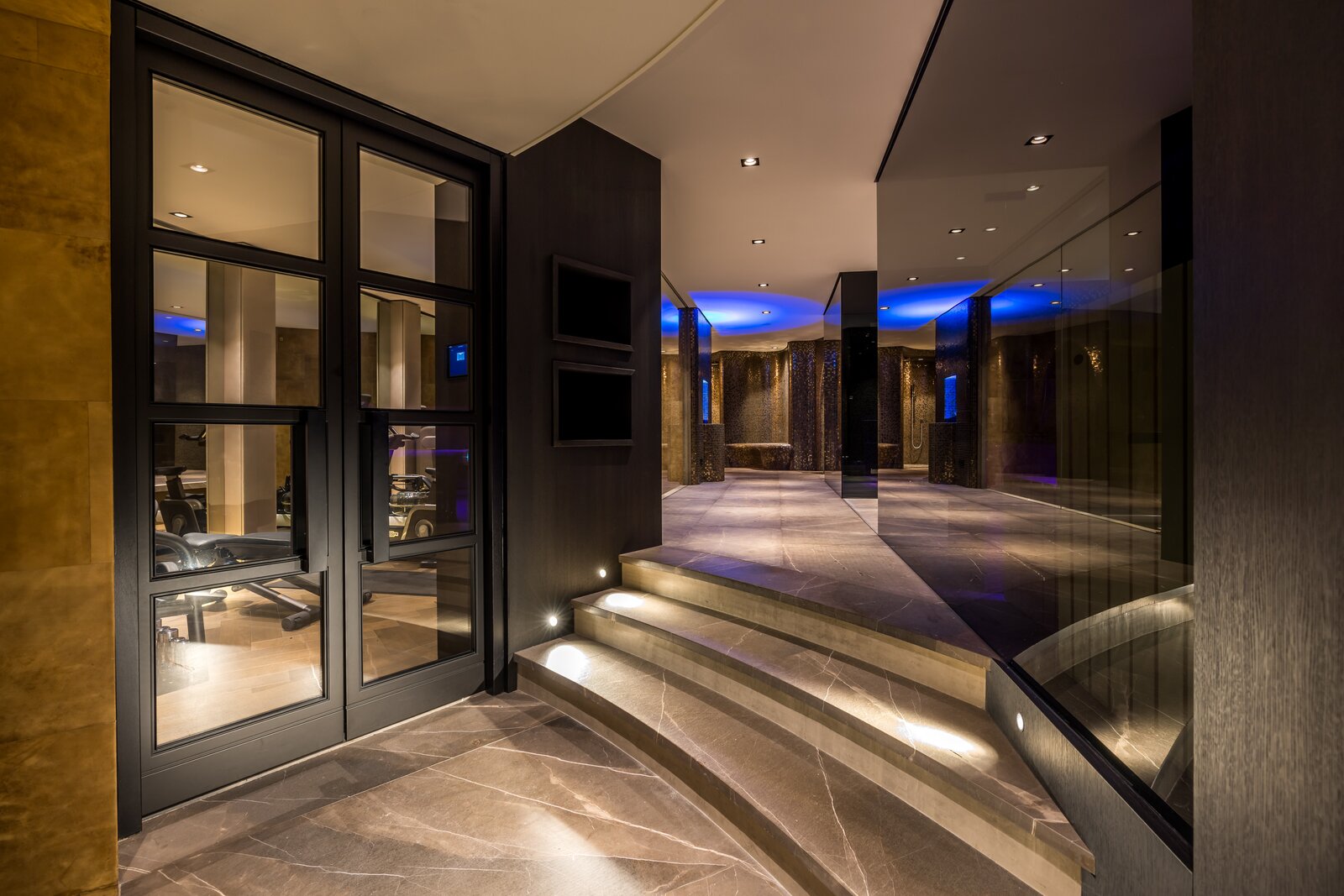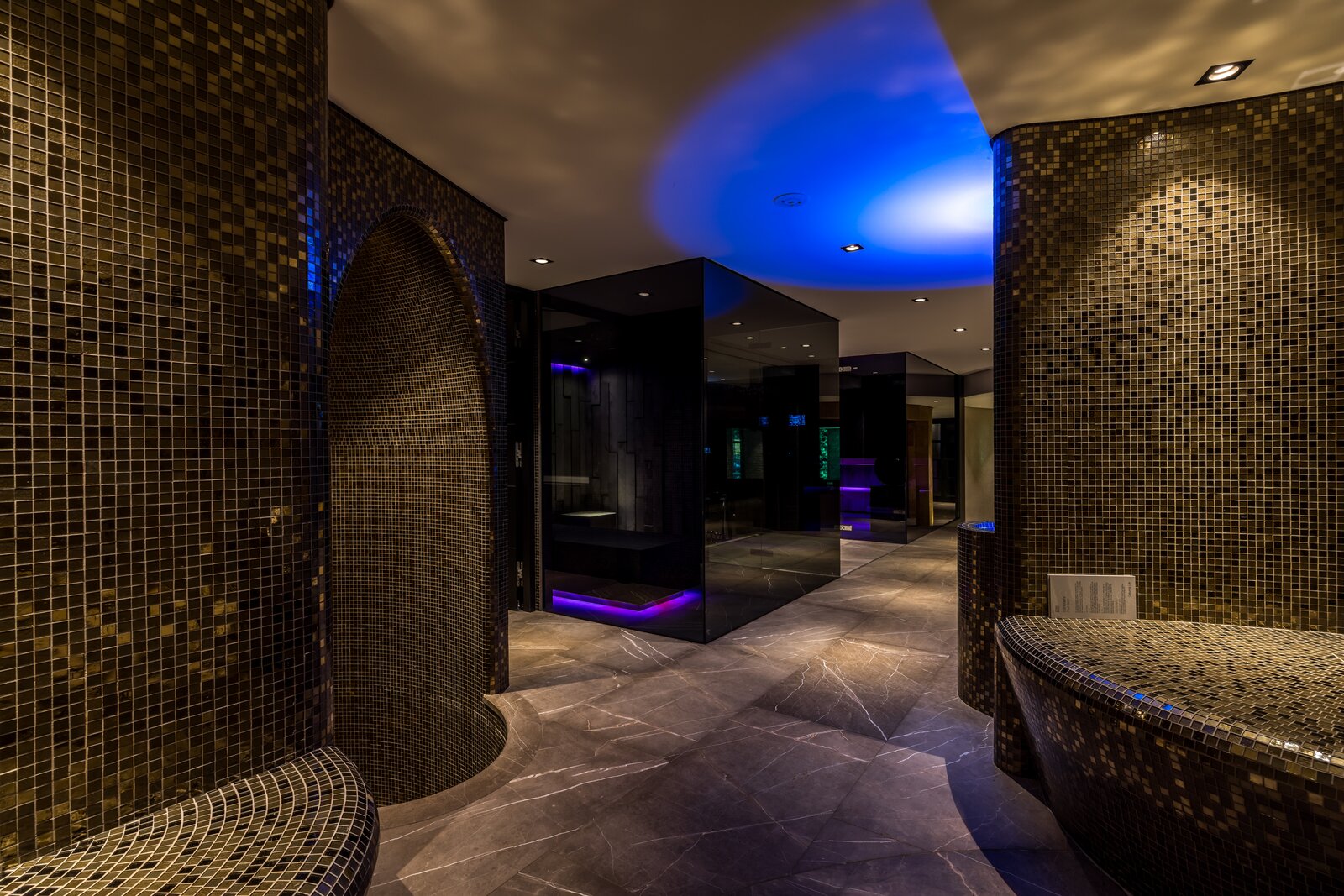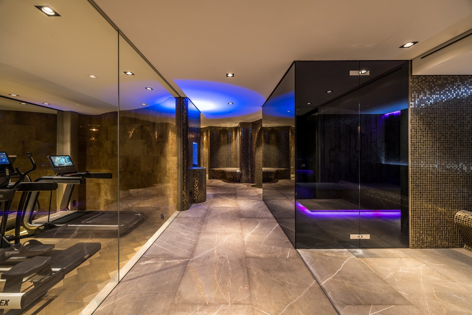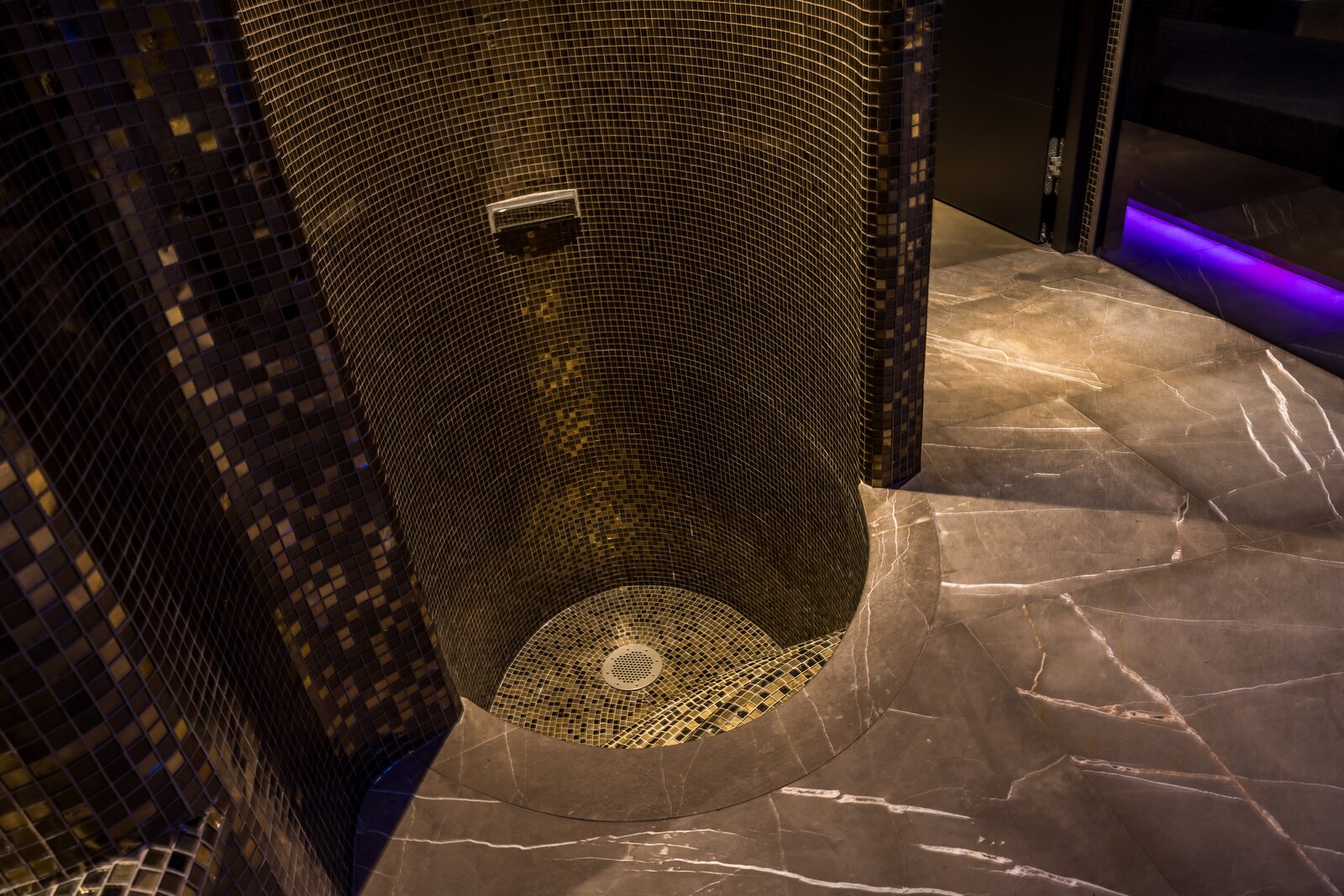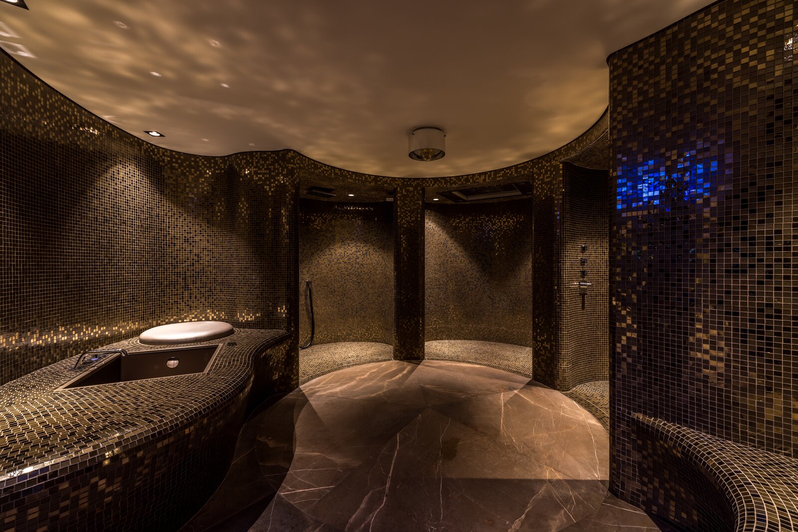 Exceptional wellness level featuring a gold-finished indoor pool with diving pit, jacuzzi, sauna, Turkish steam bath, fitness area, heated bench, foot bath, rain showers, cold plunge, and salt bath