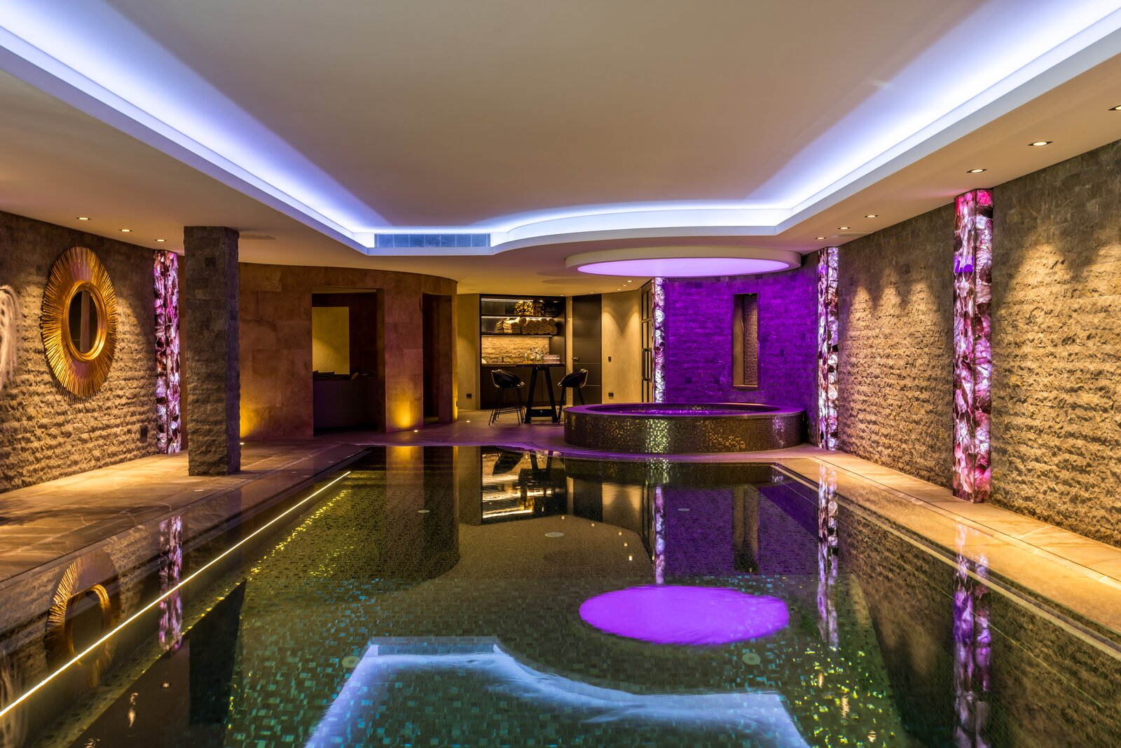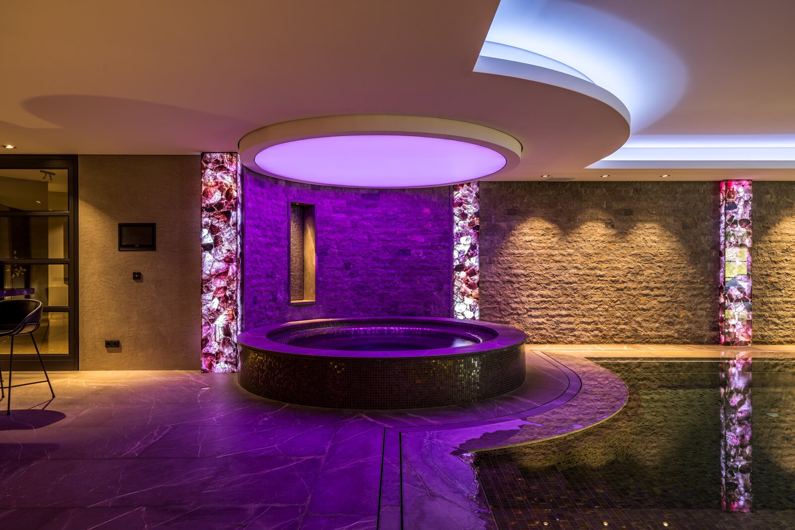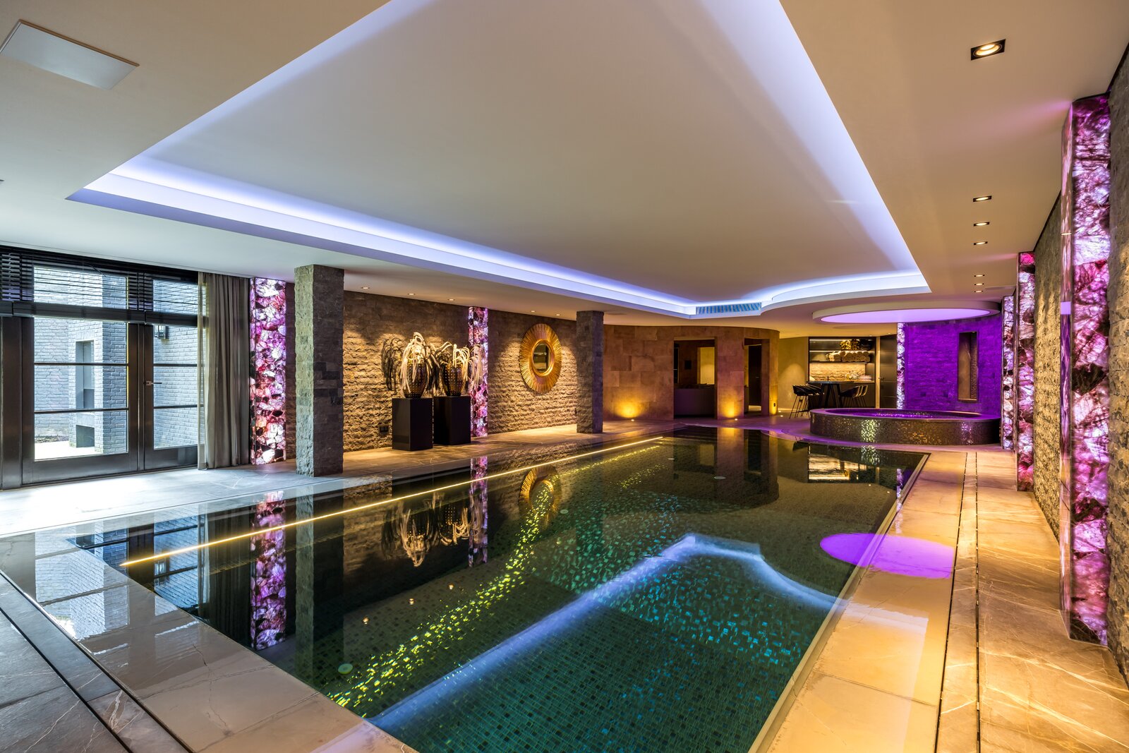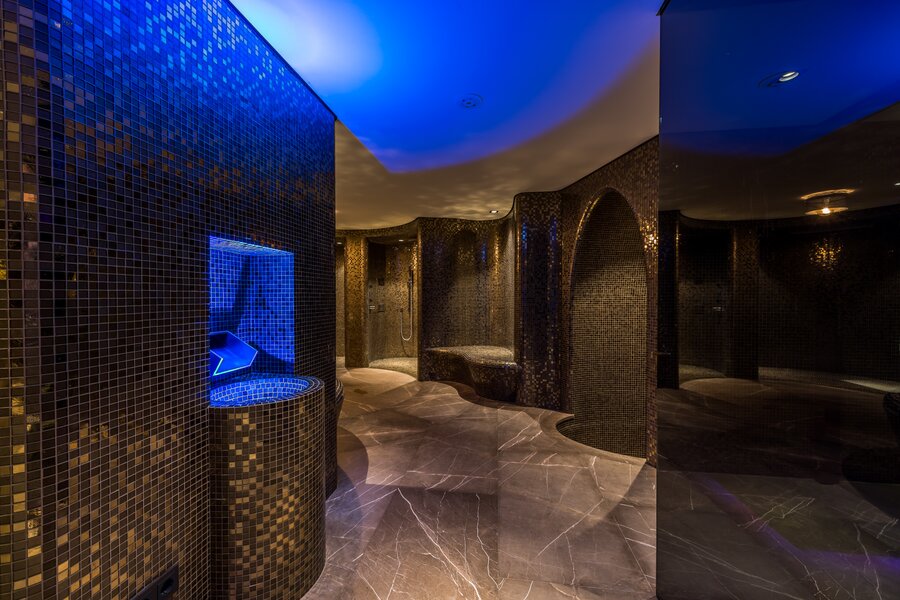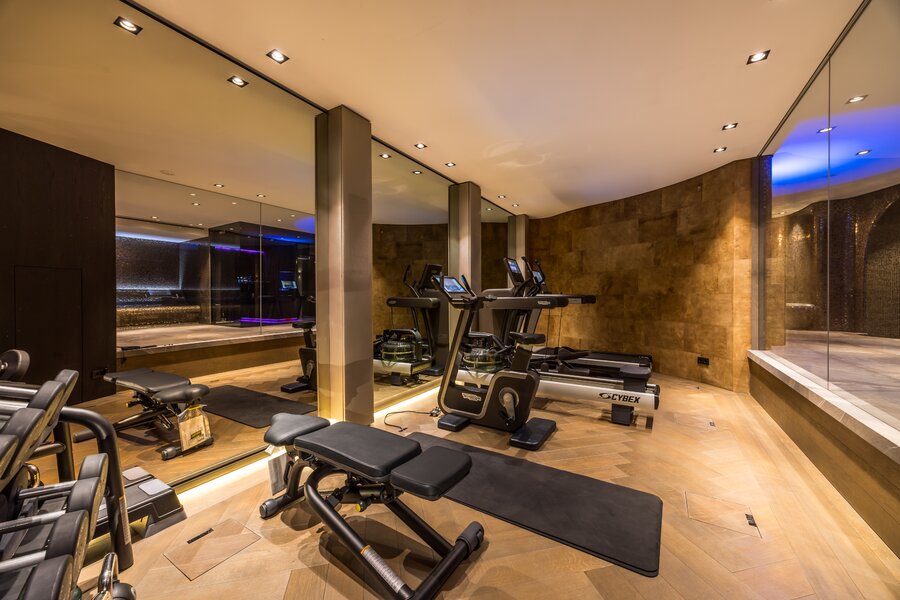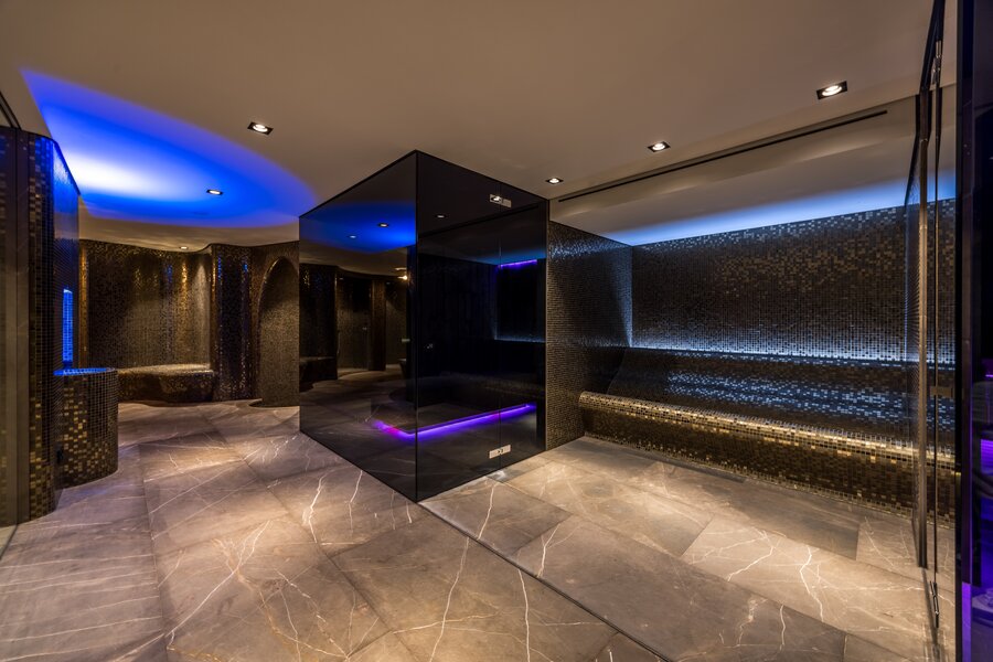 Exceptional wellness level featuring a gold-finished indoor pool with diving pit, jacuzzi, sauna, Turkish steam bath, fitness area, heated bench, foot bath, rain showers, cold plunge, and salt bath