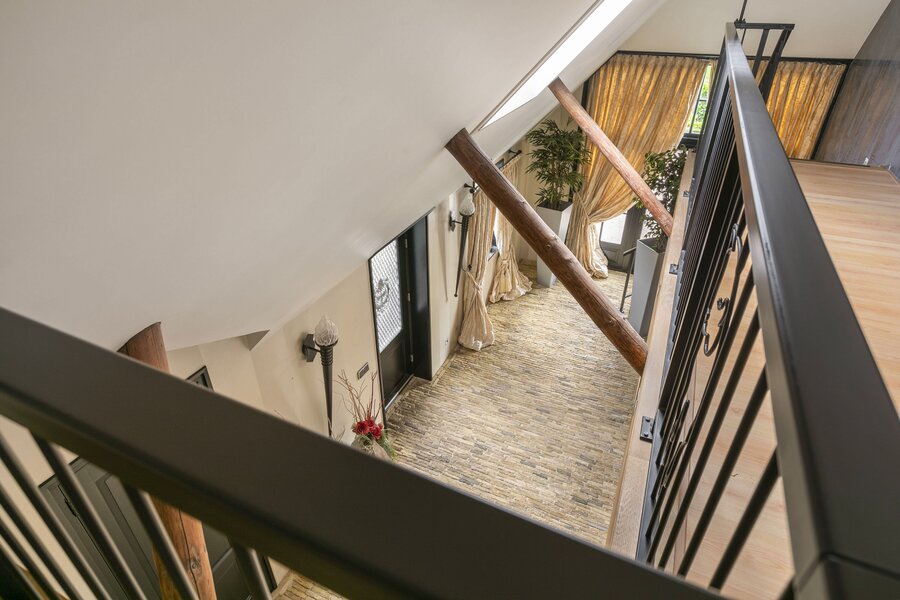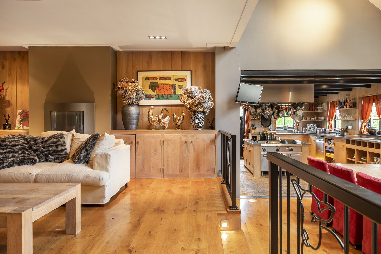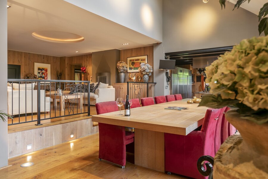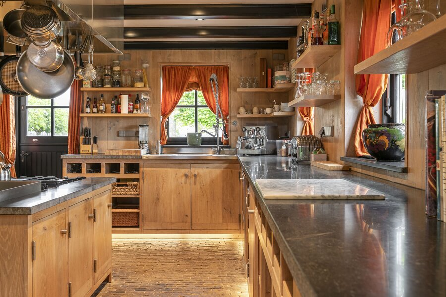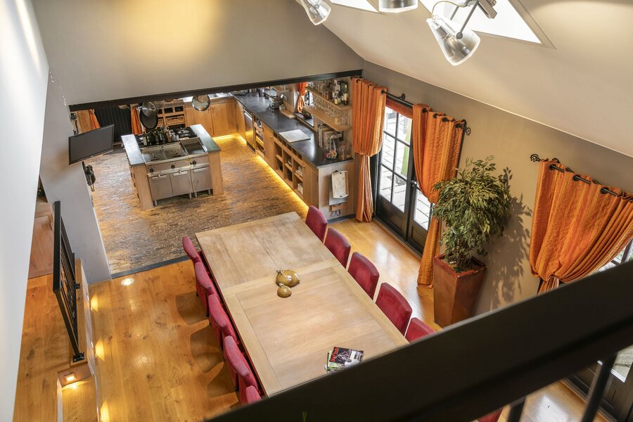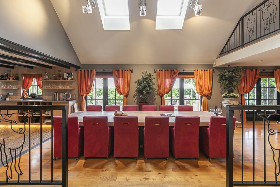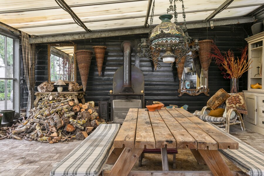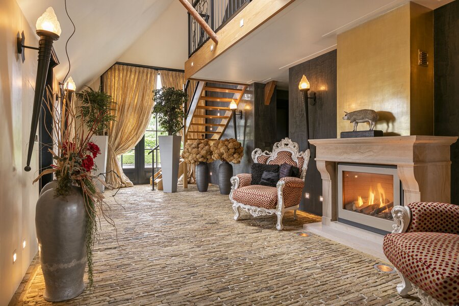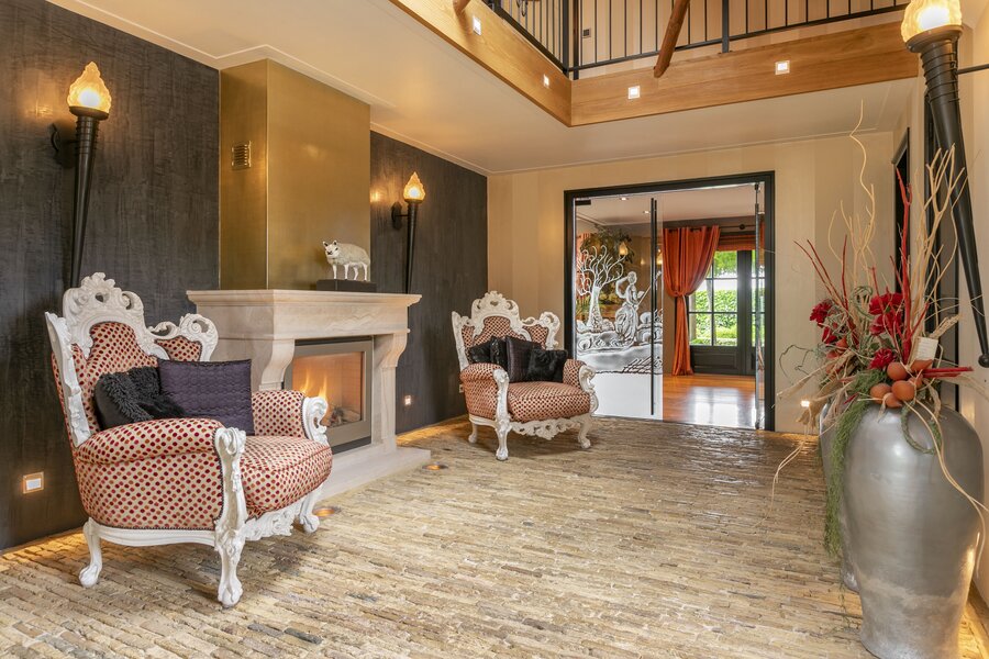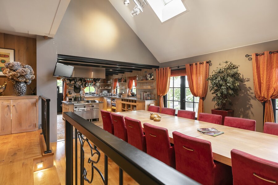 Entree, royale hal voorzien van een fraaie zandstenen sierschouw met gashaard. Trap naar de eerste verdieping en naar de slaapvertrekken en toiletruimte op de begane grond. Via de centrale hal komen we in de royale woonkamer van de stolp. Glazen deuren zijn voorzien van fraaie glasgeslepen voorstellingen. De woonkamer op opgedeeld in een verhoogd zitgedeelte met 2 gashaarden, en een woonkeuken gedeelte. Een lange eettafel siert de ruimte waaraan grote groepen uitgenodigd kunnen worden voor een diner. De vloer van de woonkamer is voorzien van brede Eiken vloerdelen. Via de openslaande deuren is er toegang tot het terras naast de woning. De woonkeuken is voorzien van professionele horeca-apparatuur. De keukenkasten zijn van handgemaakt eiken en afgewerkt met een hardstenen werkblad. De vloer van de keuken en de hal zijn van oude waaltjes. De keuken is voorzien van vloerverwarming. Vanuit het eetgedeelte is er zicht op de hoge nok van de boerderij en de bovengelegen werkkamer, welke in open verbinding staat met het woongedeelte.