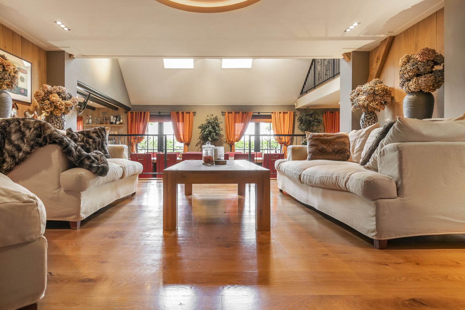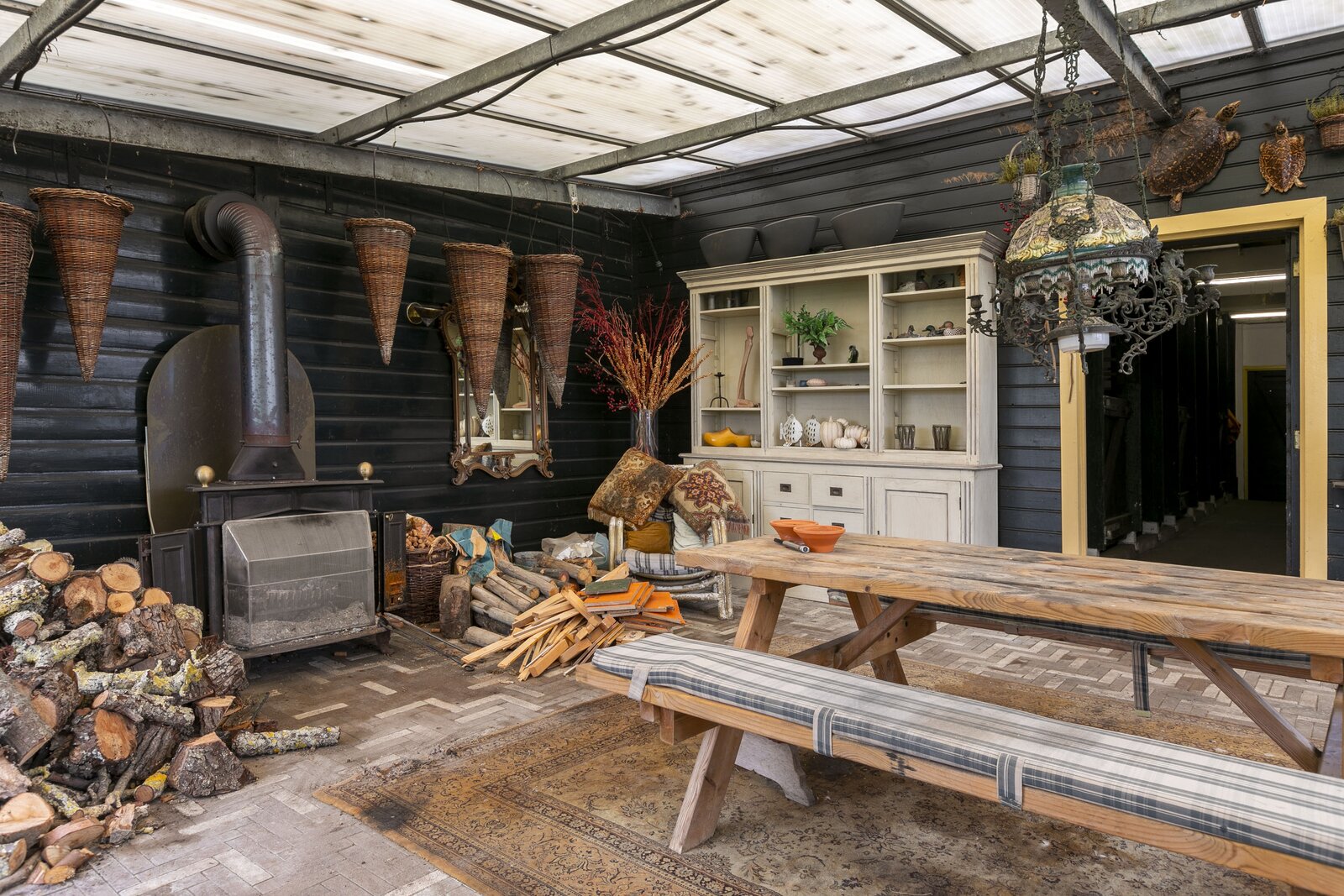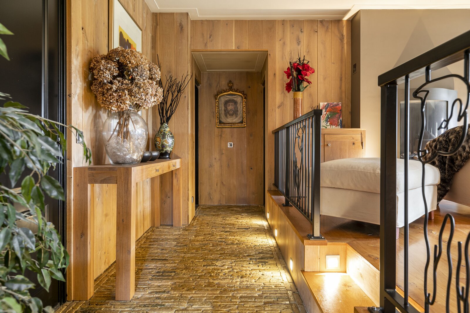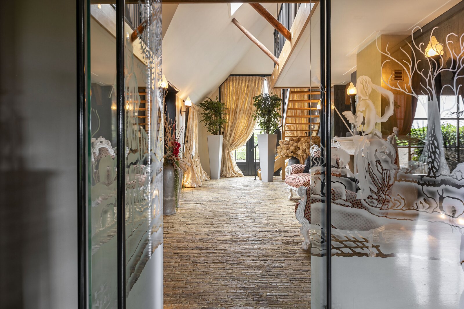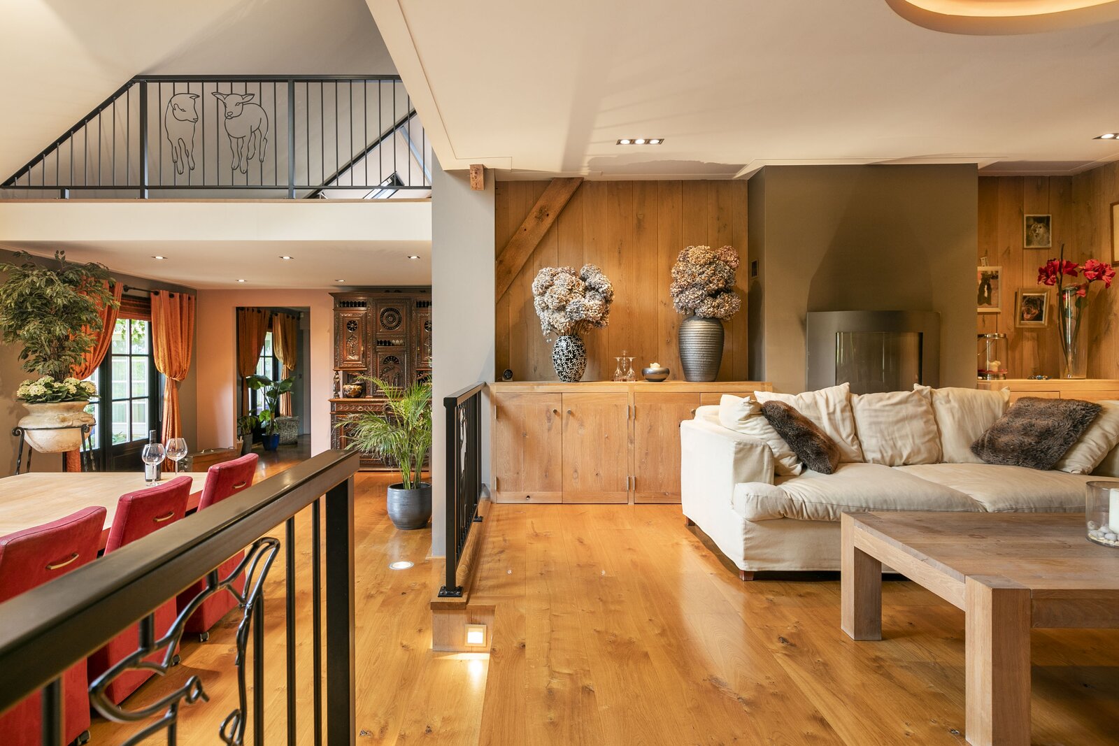 Entree, royale hal voorzien van een fraaie zandstenen sierschouw met gashaard. Trap naar de eerste verdieping en naar de slaapvertrekken en toiletruimte op de begane grond. Via de centrale hal komen we in de royale woonkamer van de stolp. Glazen deuren zijn voorzien van fraaie glasgeslepen voorstellingen. De woonkamer op opgedeeld in een verhoogd zitgedeelte met 2 gashaarden, en een woonkeuken gedeelte. Een lange eettafel siert de ruimte waaraan grote groepen uitgenodigd kunnen worden voor een diner. De vloer van de woonkamer is voorzien van brede Eiken vloerdelen. Via de openslaande deuren is er toegang tot het terras naast de woning. De woonkeuken is voorzien van professionele horeca-apparatuur. De keukenkasten zijn van handgemaakt eiken en afgewerkt met een hardstenen werkblad. De vloer van de keuken en de hal zijn van oude waaltjes. De keuken is voorzien van vloerverwarming. Vanuit het eetgedeelte is er zicht op de hoge nok van de boerderij en de bovengelegen werkkamer, welke in open verbinding staat met het woongedeelte.