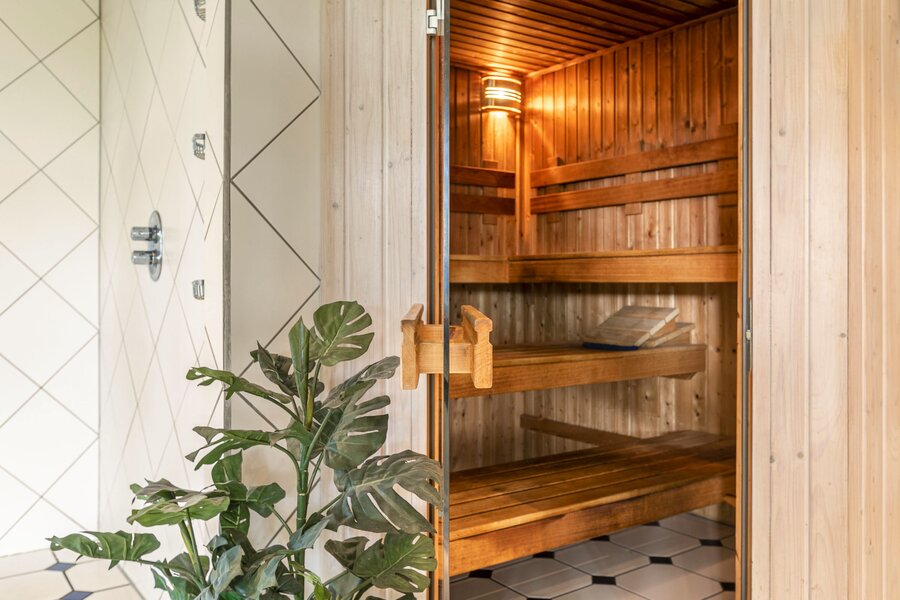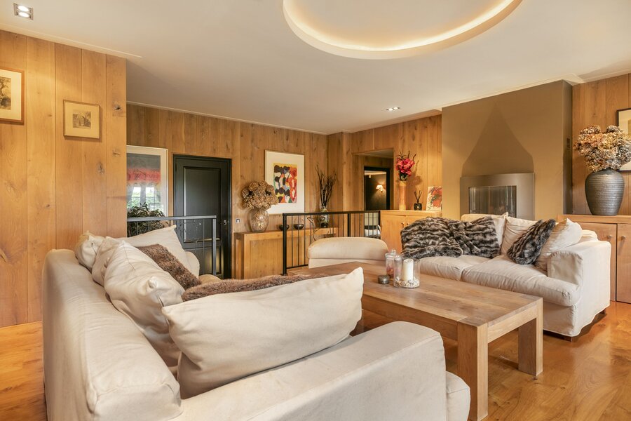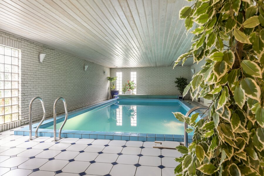 Vanuit de woonkamer is er toegang tot het inpandige verwarmde zwembad en doucheruimte. Tevens is er een separaat toiletruimte en sauna. Er zijn openslaande deuren naar te terras. De royale bijkeuken is bereikbaar via de hal en het zwembad.