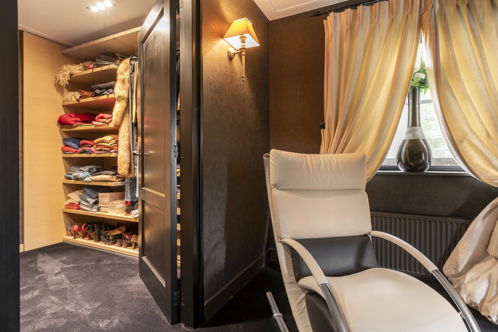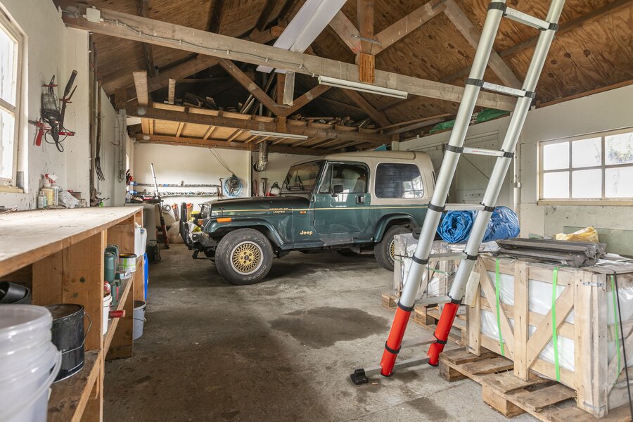 De grote dubbele garage biedt ruimte voor meerdere auto en is voorzien van een bergvliering. Ook is deze ruimte voorzien van een praktische werkbank en meerdere openslaande deuren.