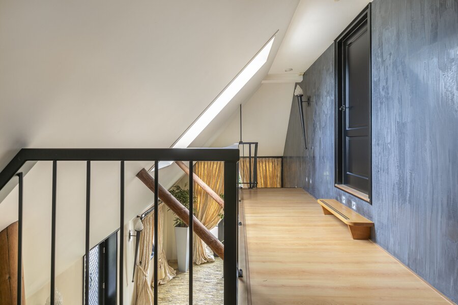 De toegangsweg naar de woning siert met een imposante toegangspoort met een automatisch ijzeren hekwerk. Het pad is voorzien van verlichting en een bomenrij met hagen, wat een statige uitstraling geeft.