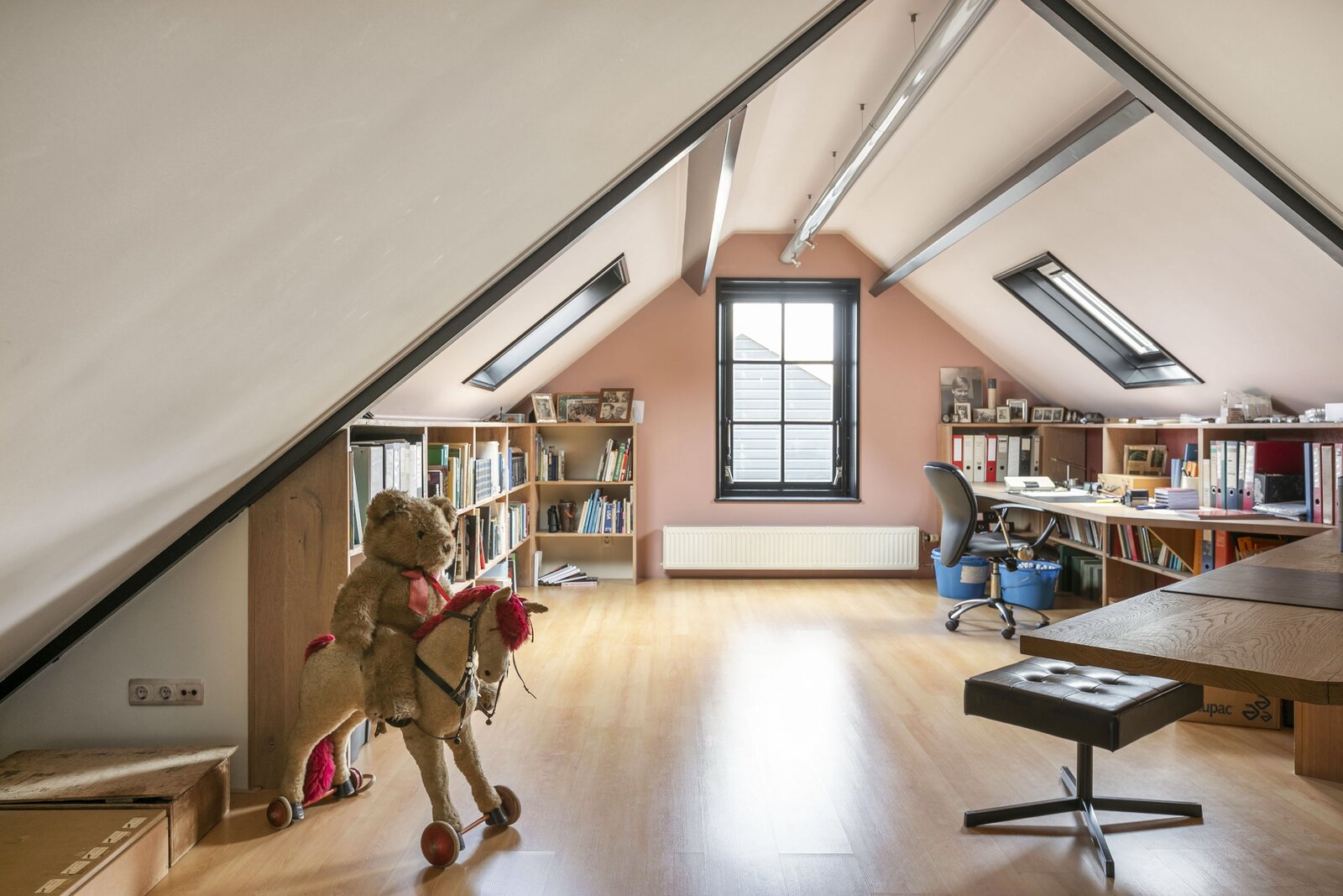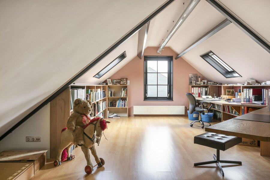 De eerste verdieping van de stolp bestaat uit een aparte werkkamer welke in contact staat met de woonkamer, en één grote ruimte die vrij ingedeeld kan worden tot meerdere slaapkamers. Deze ruimte heeft enkele Velux dakvensters. Ook is hier de stookruimte aanwezig.