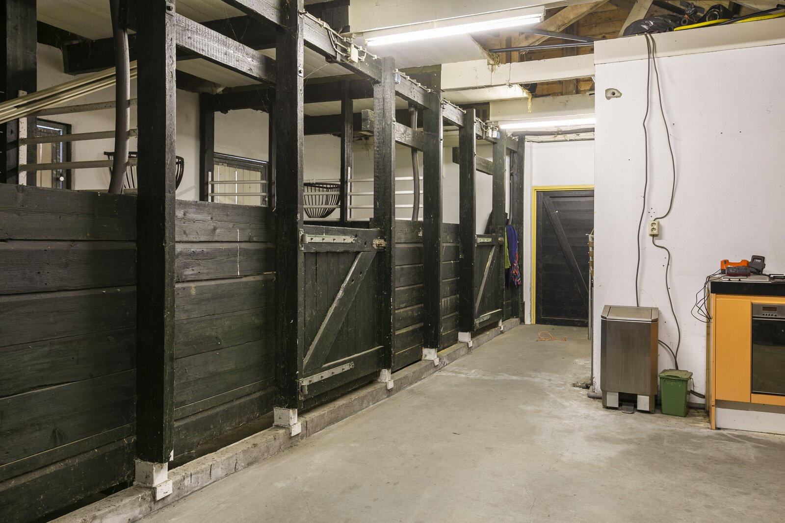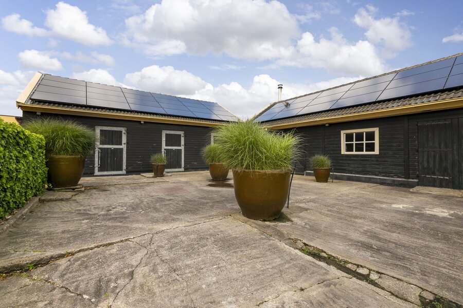 Aansluitend aan het woonhuis is een paardenstal aanwezig met meerder paardenboxen, een technische ruimte met o.a. het pomp- en zuiveringssysteem voor het zwembad, warmtepomp en boiler (2023), 70 zonnepanelen zijn geplaatst op het dak van de stal. Achter de stal is een grote serre met houtkachel.