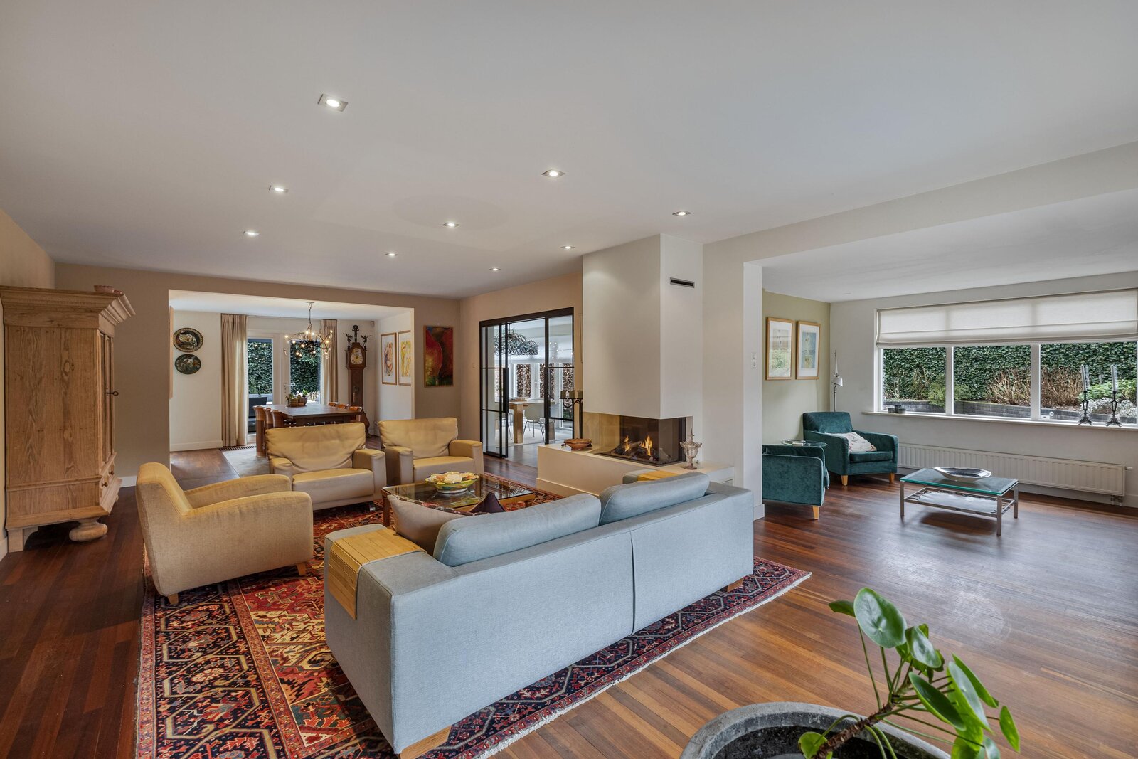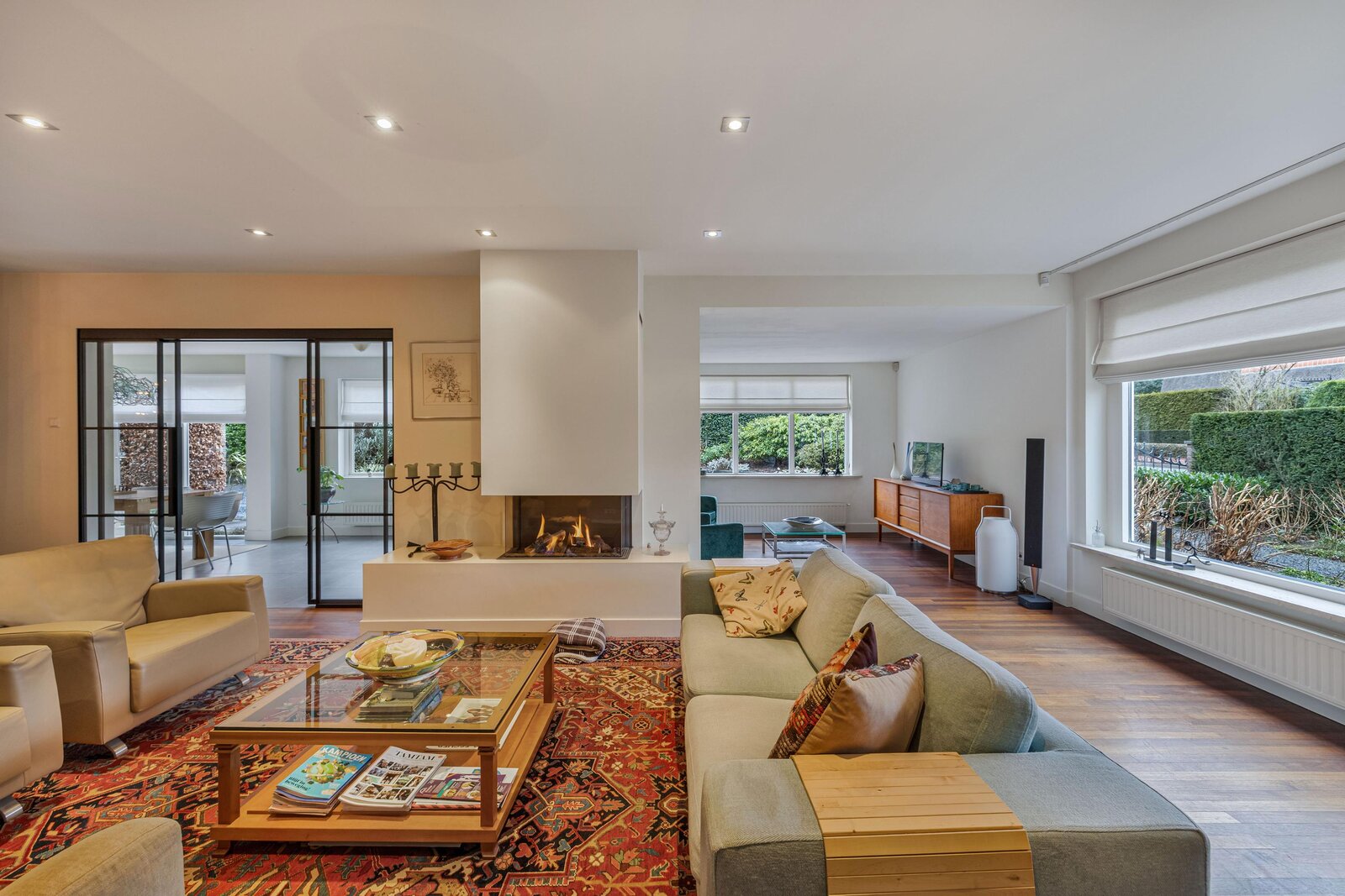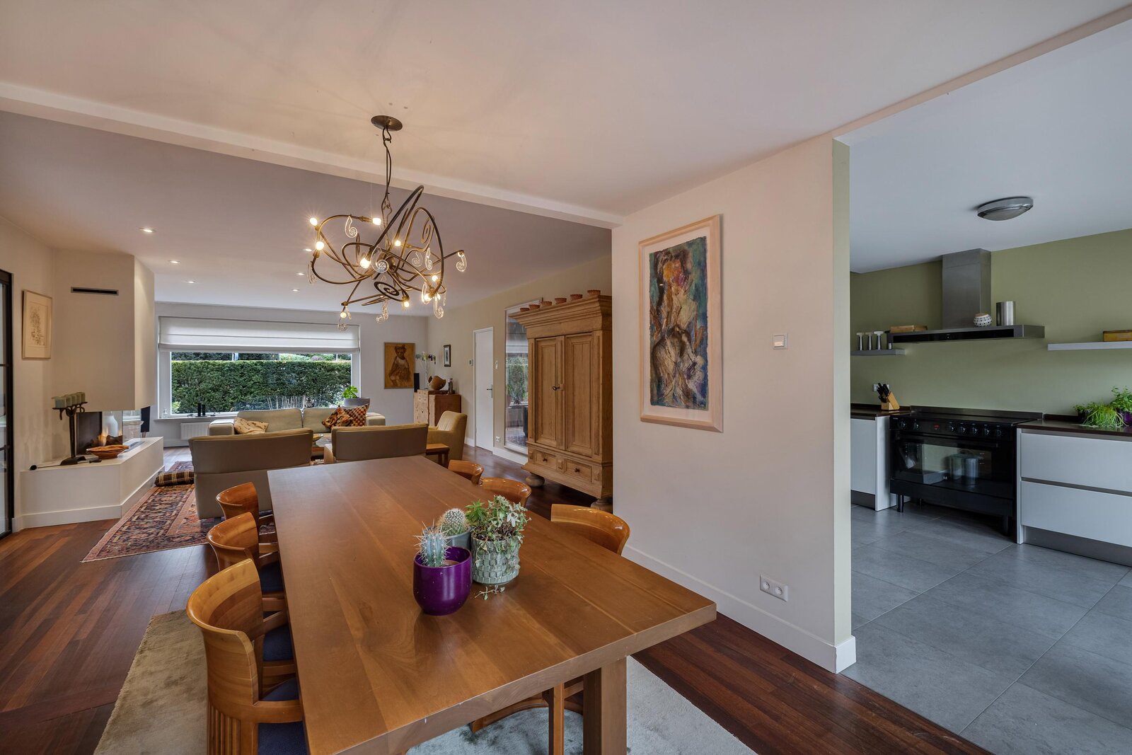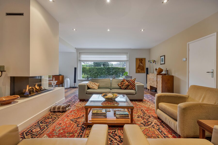 Gezellige woonkamer met gashaard waar u heerlijk kunt zitten, separate tv hoek, eetgedeelte met openslaande deuren naar de achtertuin, half open moderne keuken met inbouwapparatuur en deur naar de achtertuin.