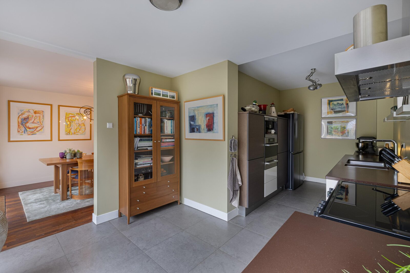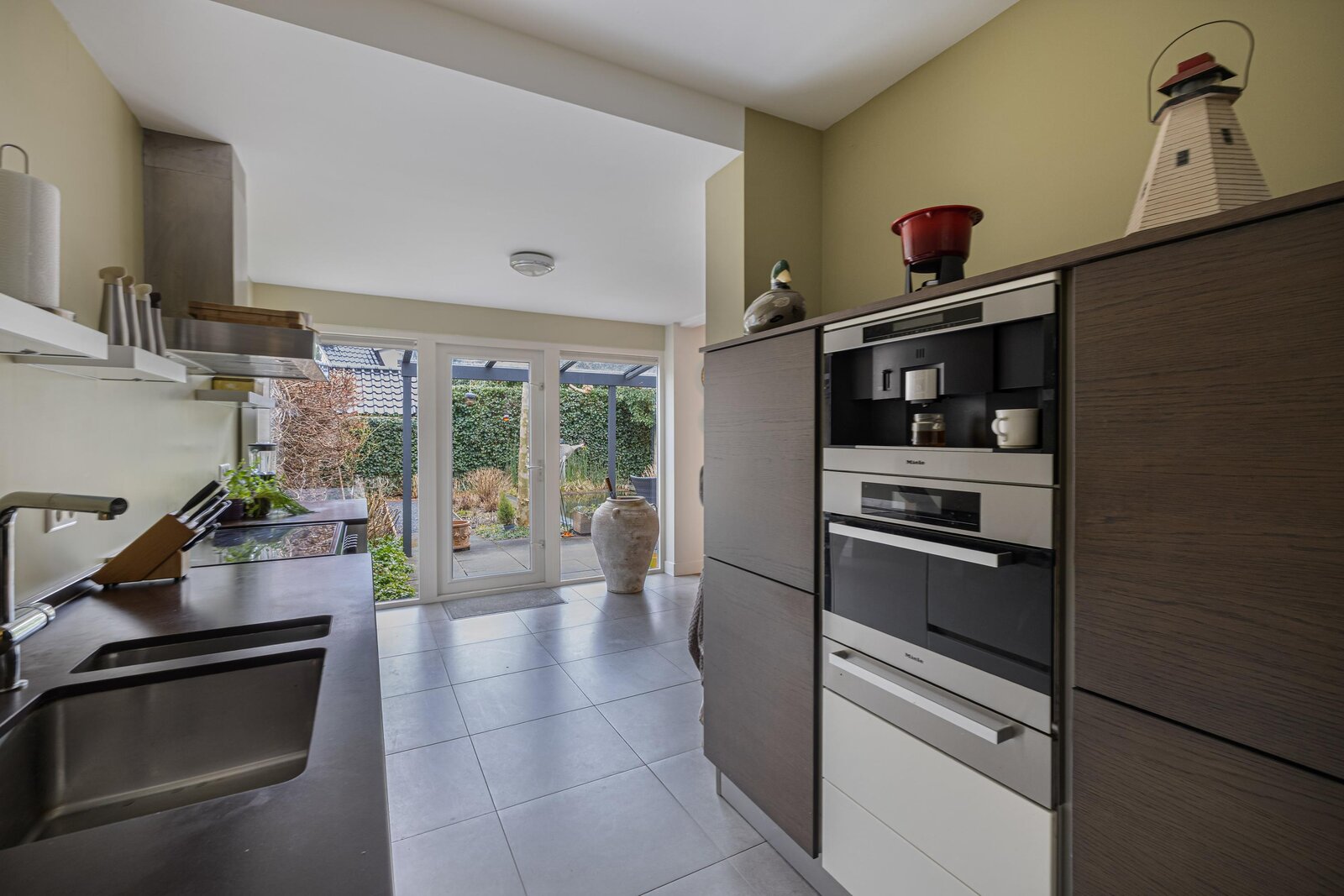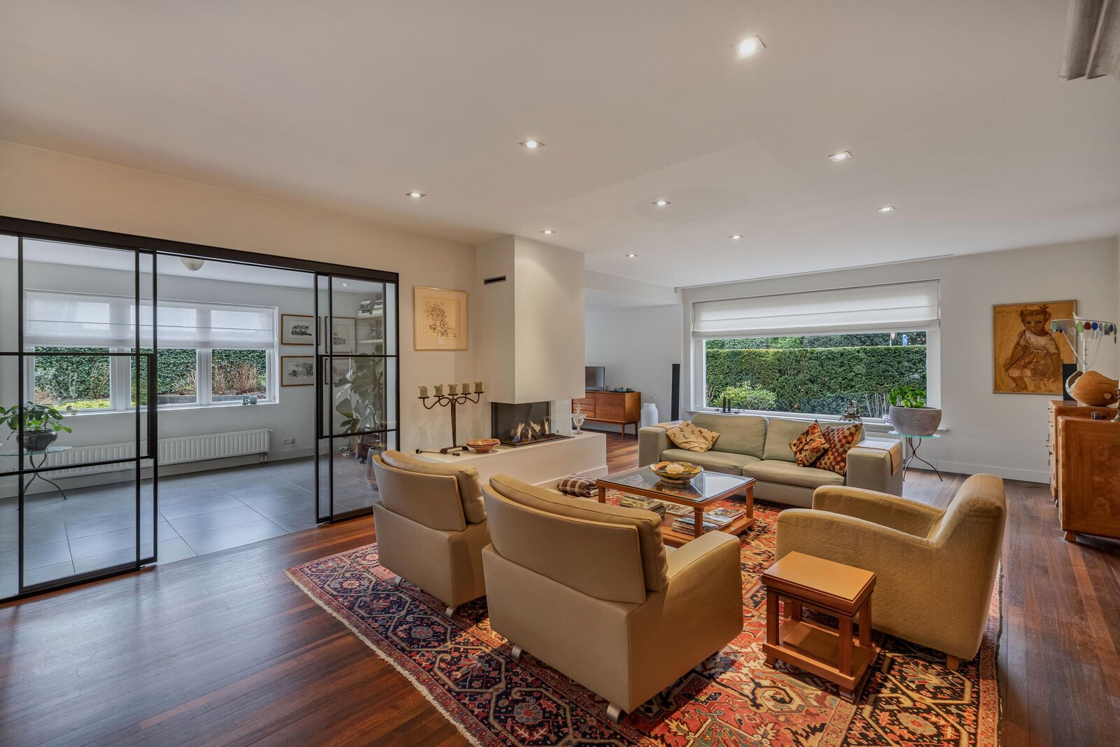 Gezellige woonkamer met gashaard waar u heerlijk kunt zitten, separate tv hoek, eetgedeelte met openslaande deuren naar de achtertuin, half open moderne keuken met inbouwapparatuur en deur naar de achtertuin.
