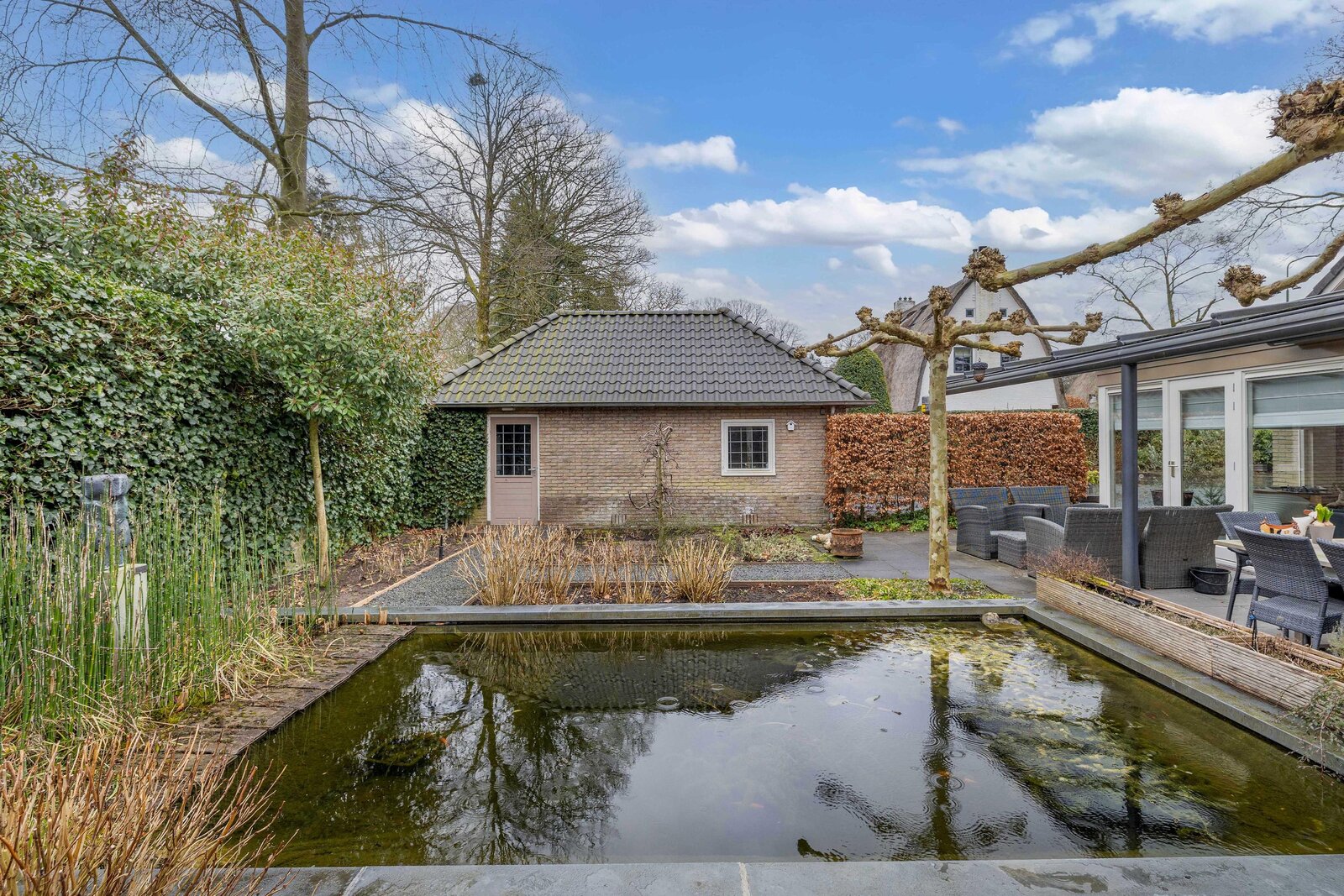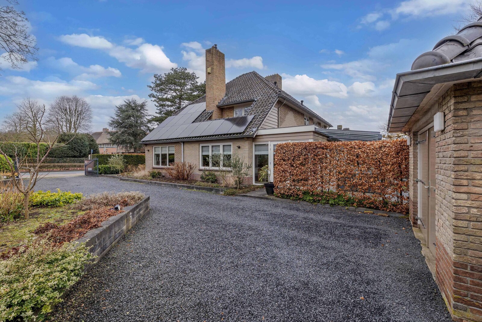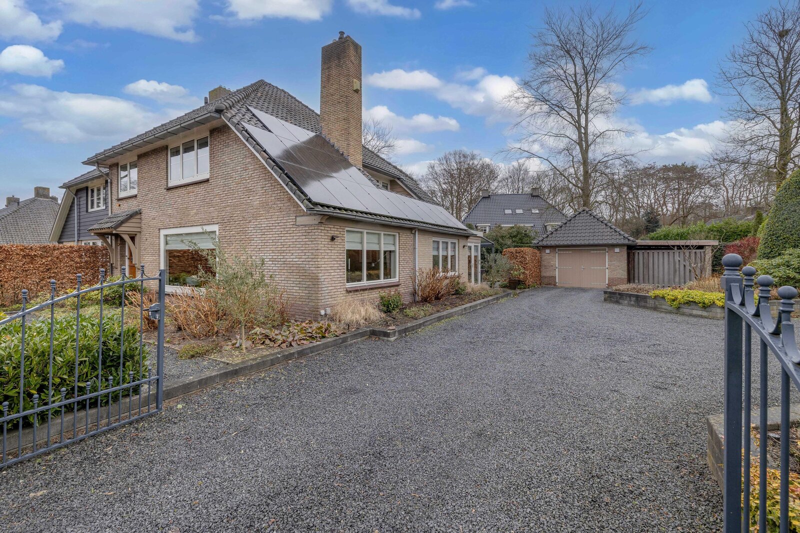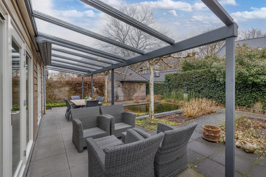 Er is een royale voor, zij en achtertuin. De zijtuin beschikt over meerdere parkeerplaatsen op eigen terrein en een vrijstaande stenen garage en een separate berging. De achtertuin is besloten met een groene haag beschikt over een fantastische glazen overkapping en veel privacy. U kunt hier heerlijk in de zon toeven. ook vanuit de achtertuin is de garage bereikbaar.